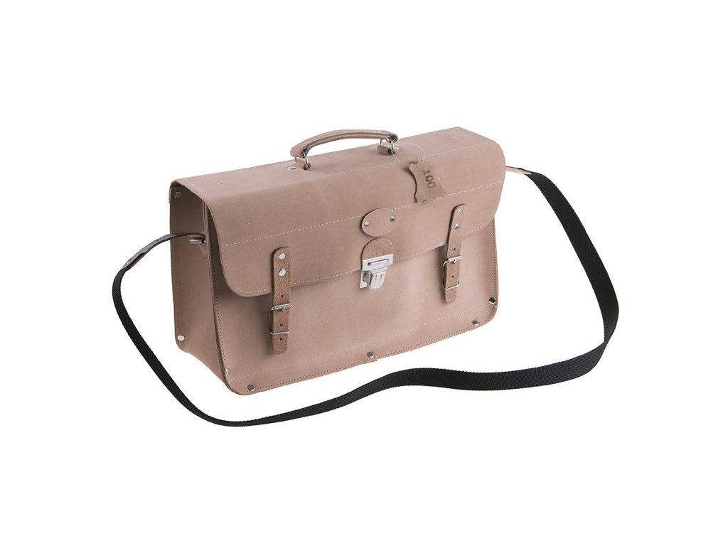 Instalatérská brašna z přírodní usně s vyztuženým dnem a kapsou na výkresy. Brašna je ušita speciální PES nití Amann, nosnost nitě je 12 kilo, švy jsou v exponovaných místech ještě nýtovány. Prvky: držadlo, popruh přes rameno, ocelová výztuha hřbetu. Vnitřní konstrukce: 1 plochá kapsa na dokumenty. Výztuhy: dno, hřbet. Hlavní materiál: přírodní hovězinová useň.