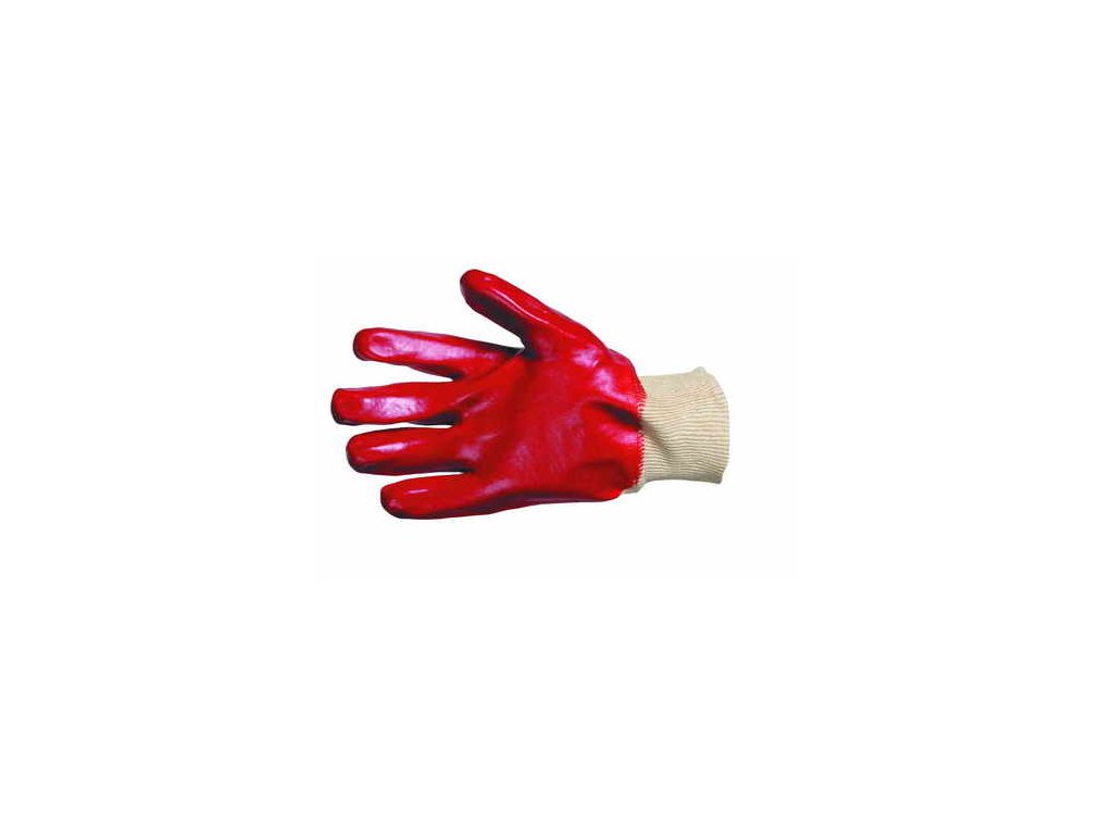 Rukavice šité z bavlněného úpletu s pružným nápletem, polomáčené v PVC v dlani a na prstech.