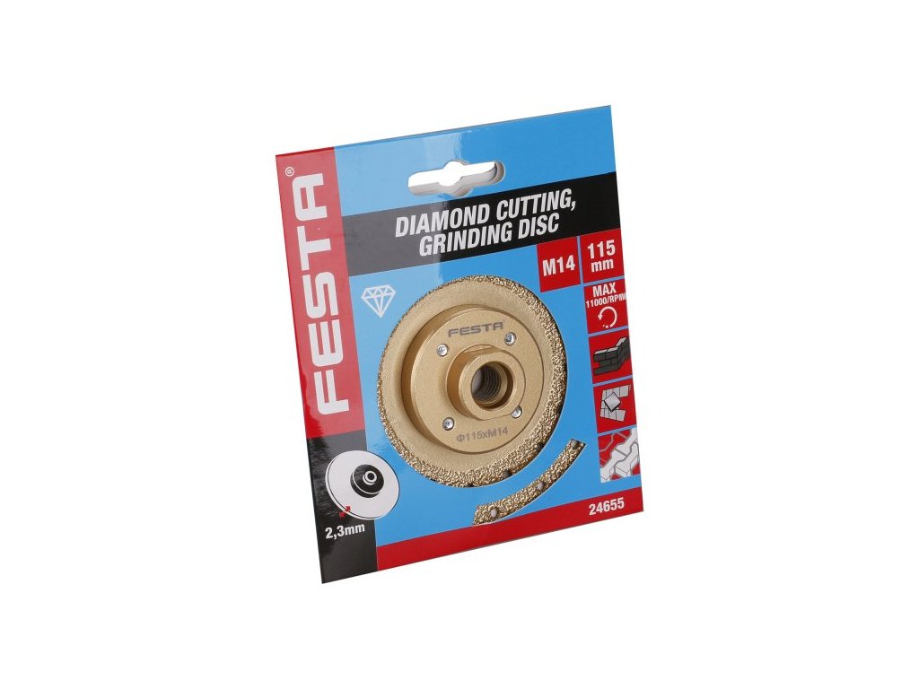 diamantový řezný a brusný kotouč s uchycením na úhlovou brusku M14 vhodný pro řezání a broušení dlažby, obkladů, slinuté dlažby, gresu, žuly, mramoru apod. vhodný na rychlé zbroušení dlažby nebo obkladu pro "kamenický roh" diamantová vrstva pro dlouhou životnost (závisí na tvrdosti nejčastěji řezaného materiálu) Instruktážní video