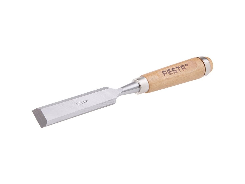 Dláto CrV 25mm/280 mm s ergonomickou rukojetí z bukového dřeva, úderová plocha s kovovým kroužkem, která zvyšuje její pevnost. Čepel je kovaná z CrV oceli tvrzená po celé délce.