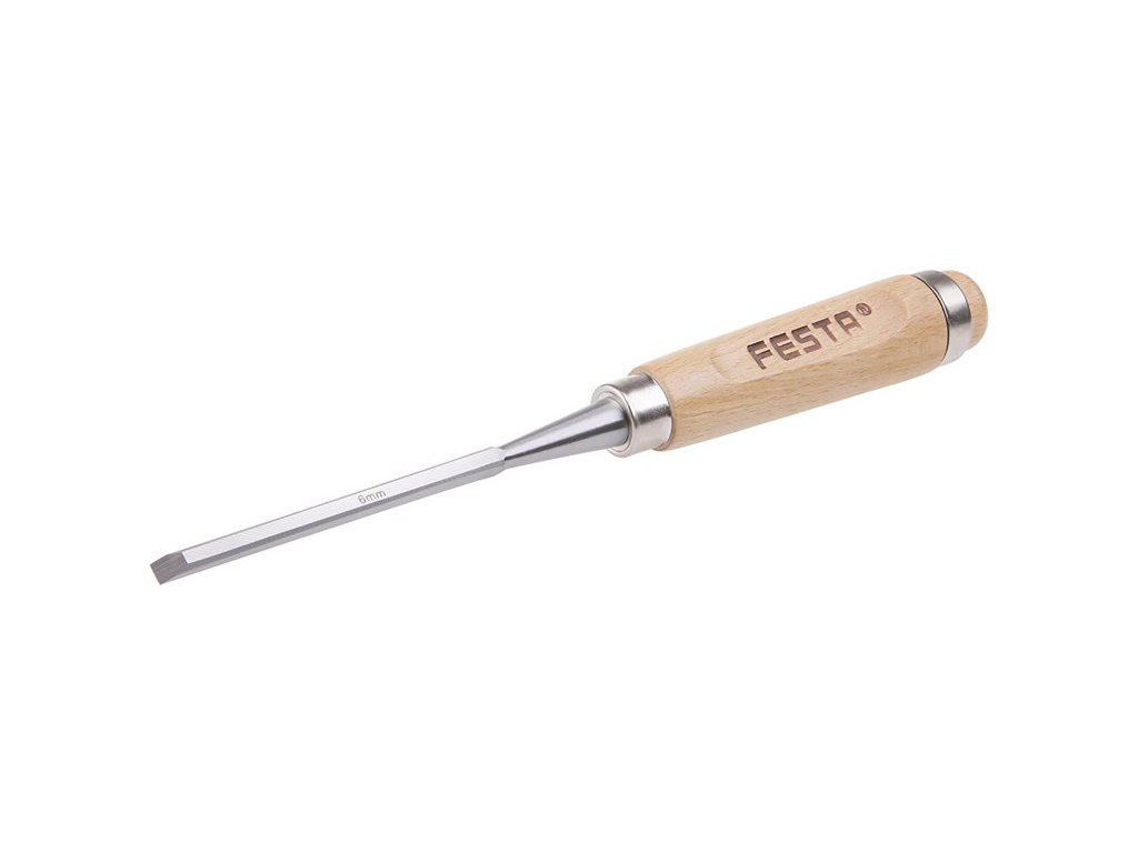 Dláto CrV 6mm/275 mm s ergonomickou rukojetí z bukového dřeva, úderová plocha s kovovým kroužkem, která zvyšuje její pevnost. Čepel je kovaná z CrV oceli tvrzená po celé délce.