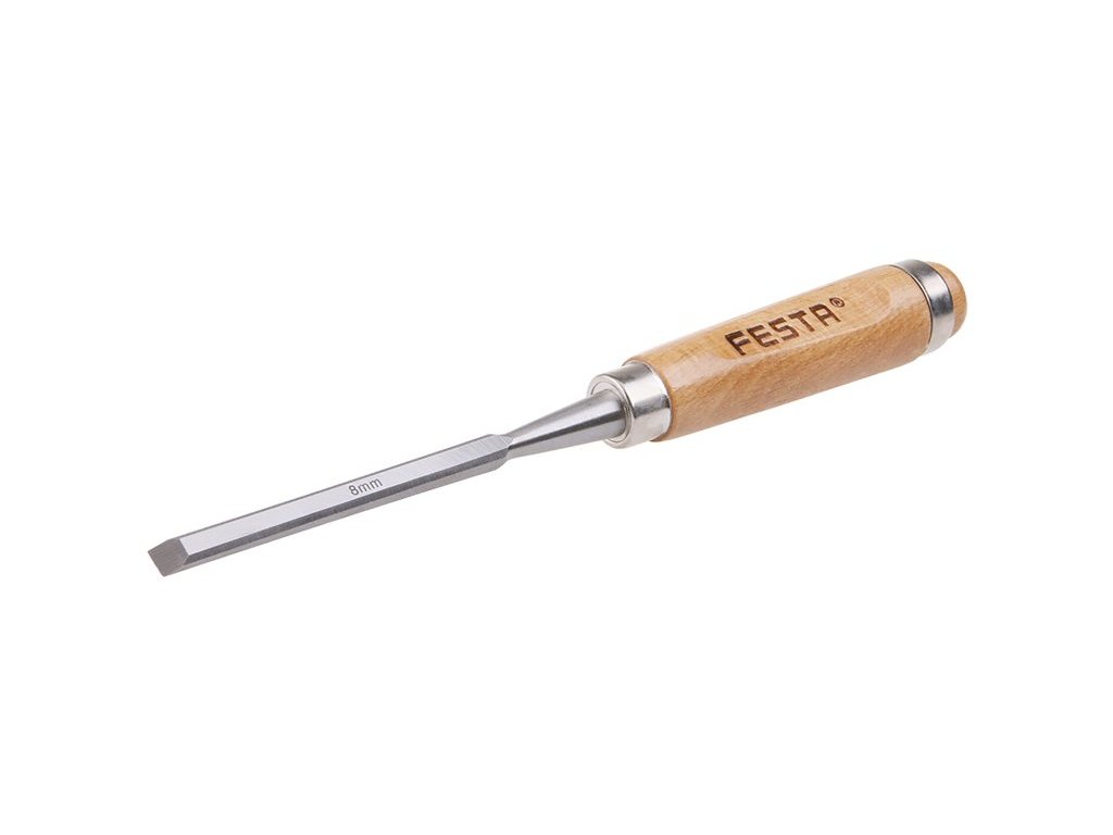 Dláto CrV 8mm/275 mm s ergonomickou rukojetí z bukového dřeva, úderová plocha s kovovým kroužkem, která zvyšuje její pevnost. Čepel je kovaná z CrV oceli tvrzená po celé délce.