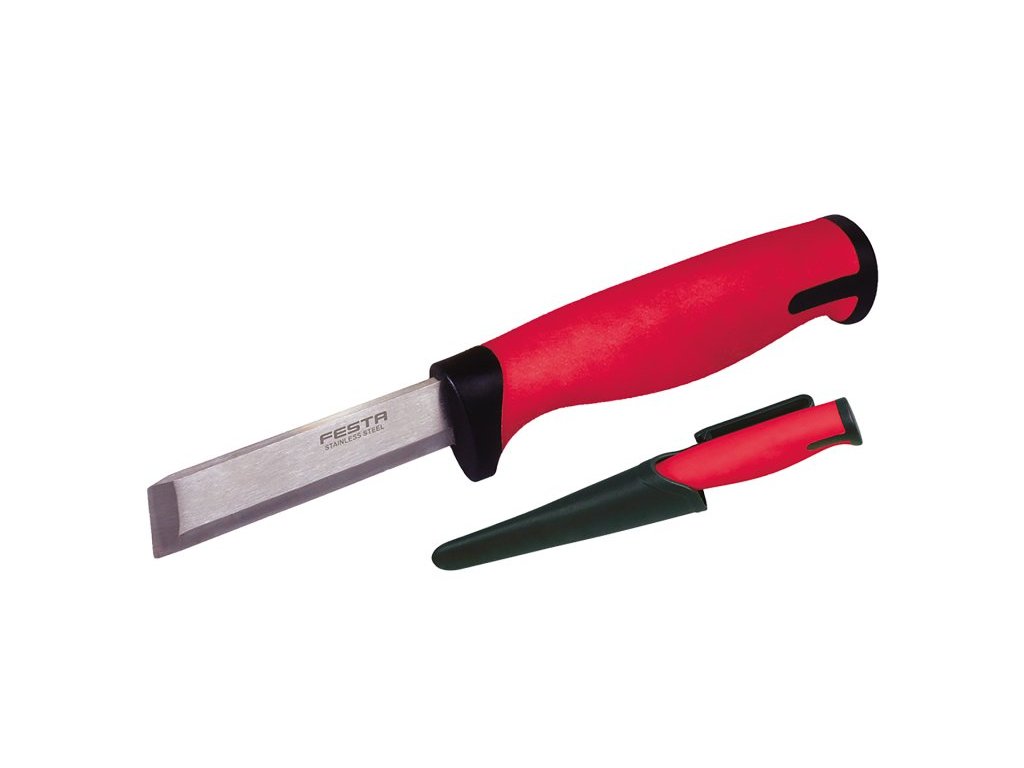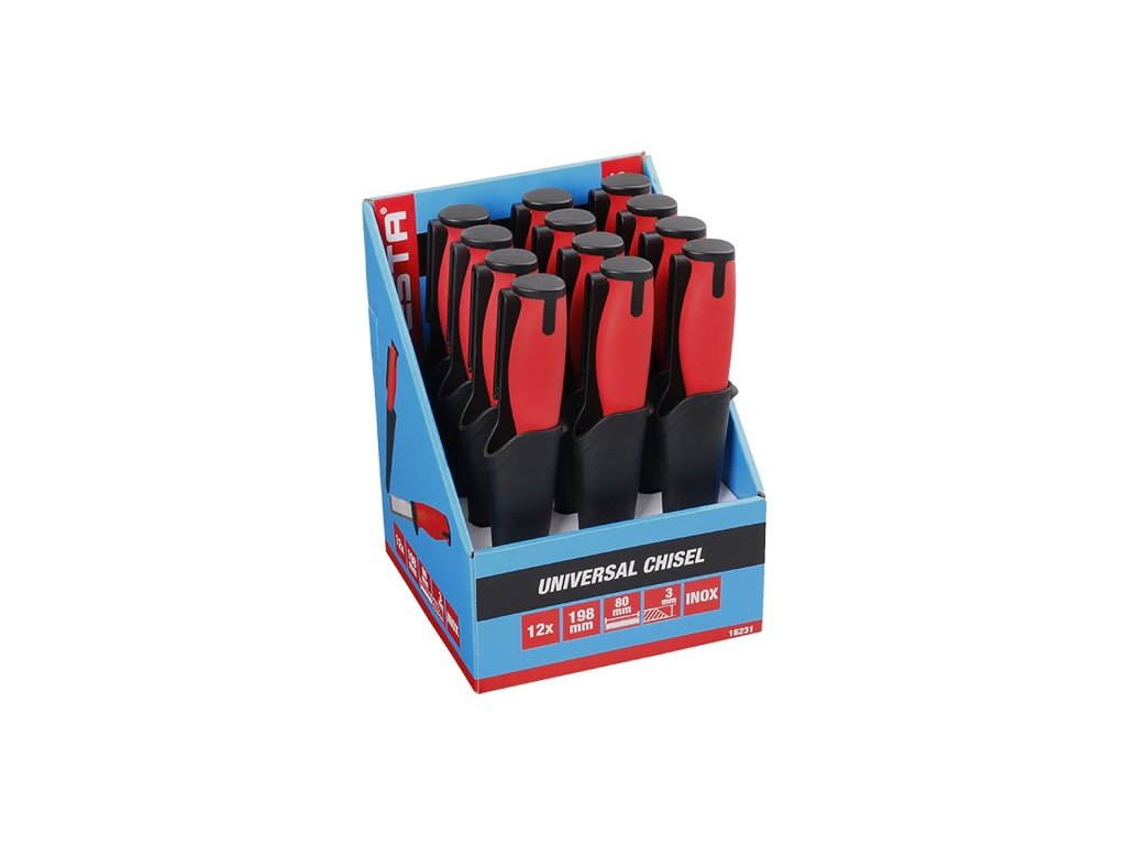 truhlářské multifunkční dláto FESTA s dvoustranným ostřím kvalitní nerezová zesílená čepel 3 mm, šířka 22 mm, délka 80 mm, celková délka 200 mm čepel odolná vůči úderům kladiva dvoukomponentní ergonomická rukojeť bezpečné pozdro s klipem pro řezbářské, truhlářské práce prodejní prezentační box 12 kusů