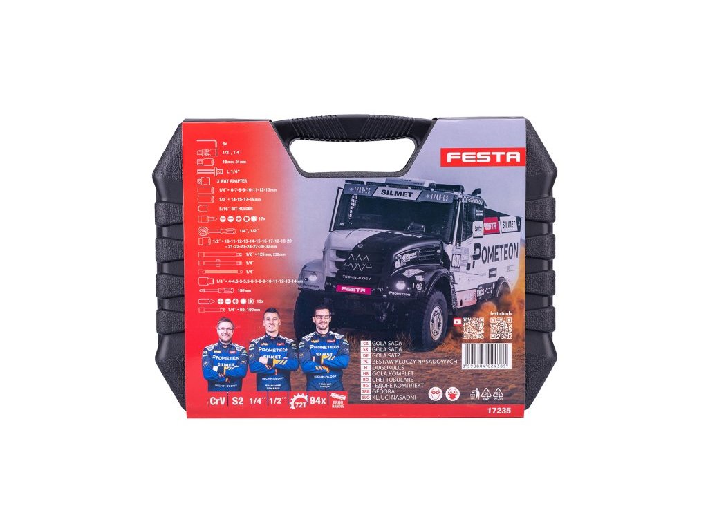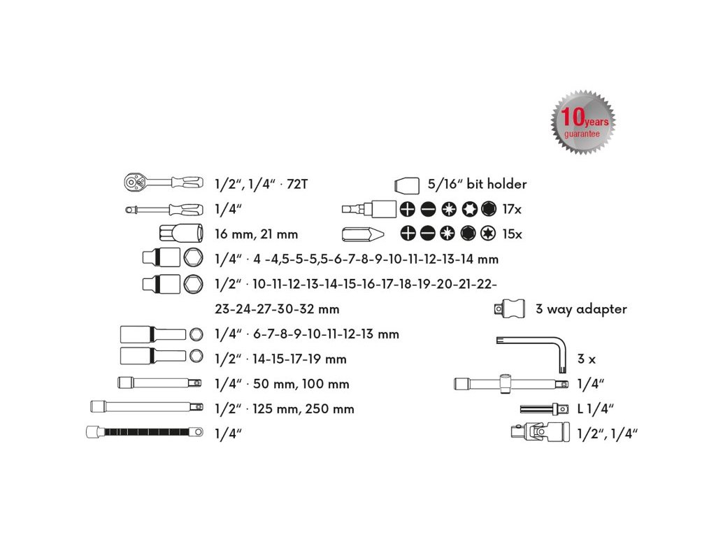 Kvalitní gola sada je vhodná díky kvalitě použitých materiálů a zpracování v profesionální autodílně nebo servisu. 10 let záruka. Všechny části jsou vyrobeny z vysoce kvalitní chrom-vanadiové oceli. Niklová povrchová úprava. Hroty bitů jsou ze slitiny oceli S2. Ráčny mají jemné dělení 72 zubů, tělo ráčny z CrV oceli, zubový mechanismus z S2 oceli, ergonomicky tvarovanou rukojeť se zdravotně nezávadnou gumou. Nový design plastového kufru z primárního materiálu s kovovými uzávěry a panty víka.