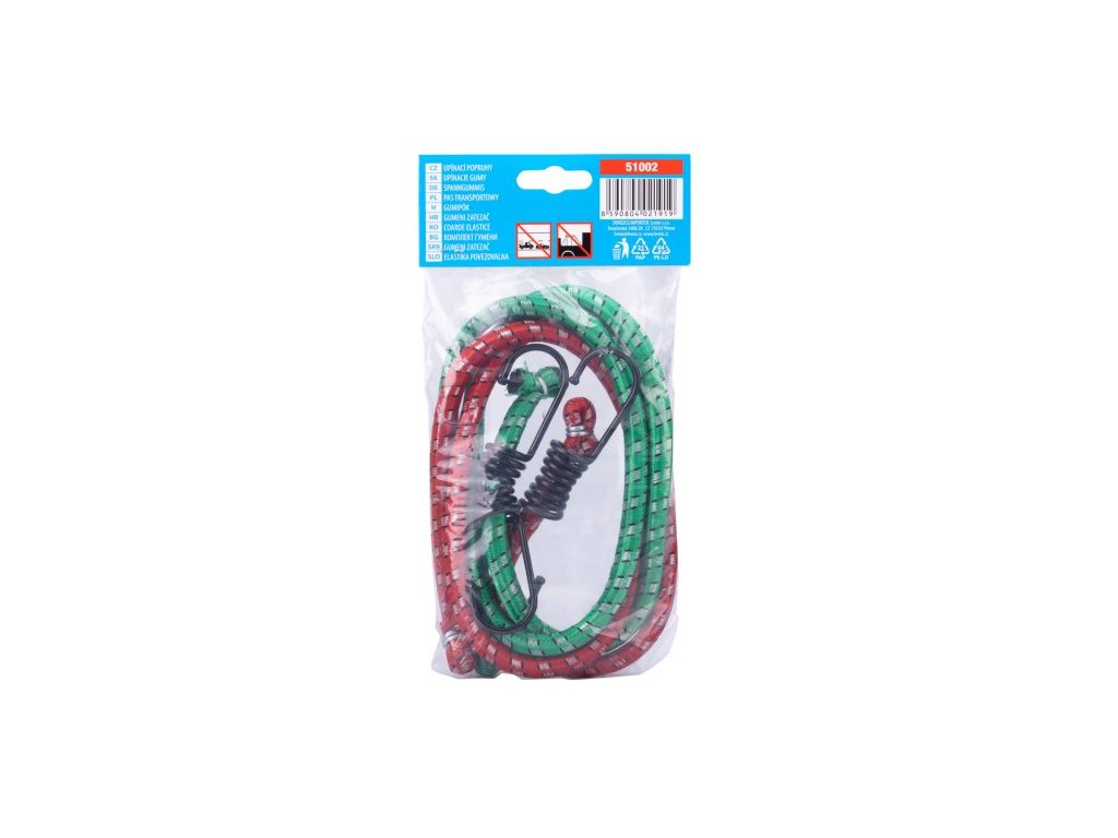 Elastické gumové popruhy, opletené polyesterem a zakončené oboustranně háky z ocelových poplastovaných drátů k uchycování zavazadel.