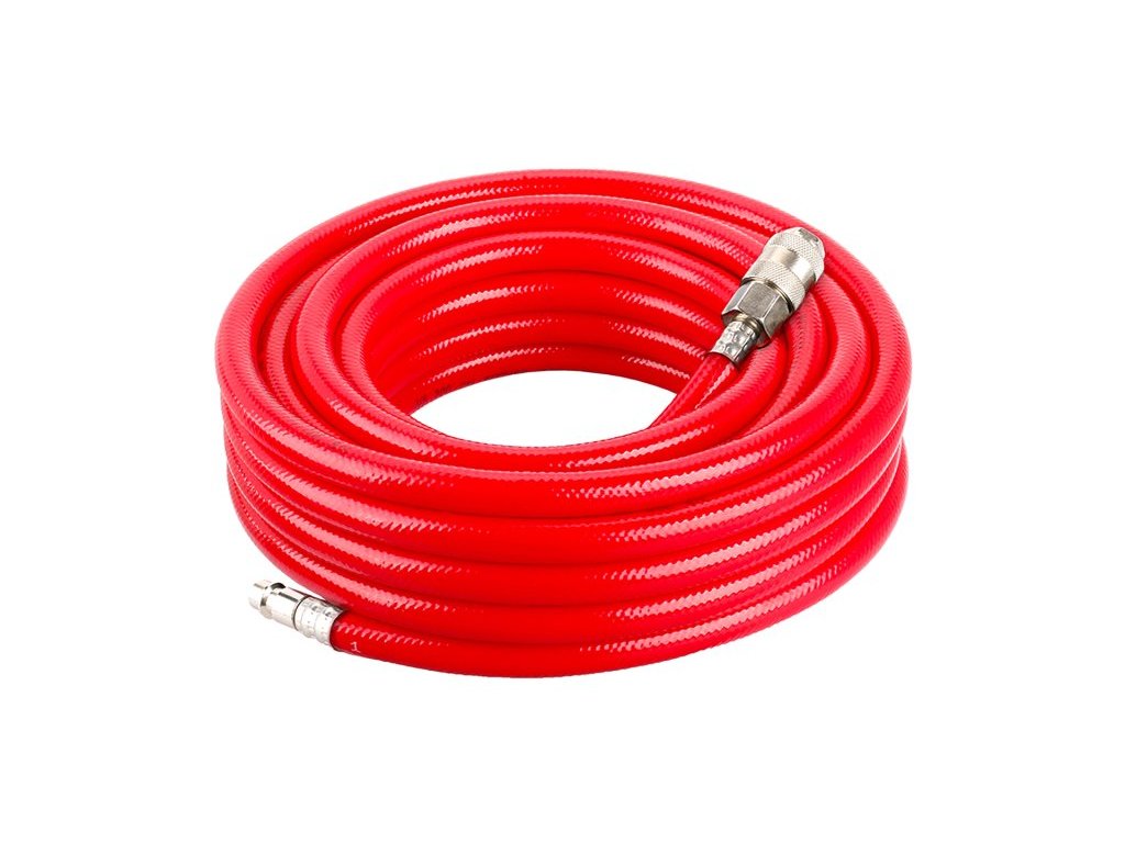 vzduchová tlaková hadice s rychlospojkami pro rozvod - přívod stlačeného vzduchu dvouplášťová PVC hadice, vysokopevnostní PES opletení, vnitřní průměr 9 mm, vnější 15 mm maximální možný tlak 20 bar hadice zakončená rychlospojkou pro rychlé napojení na kompresor, nebo prodloužení a STOP rychlospojkou pro rychlé připojení, nebo výměnu nářadí