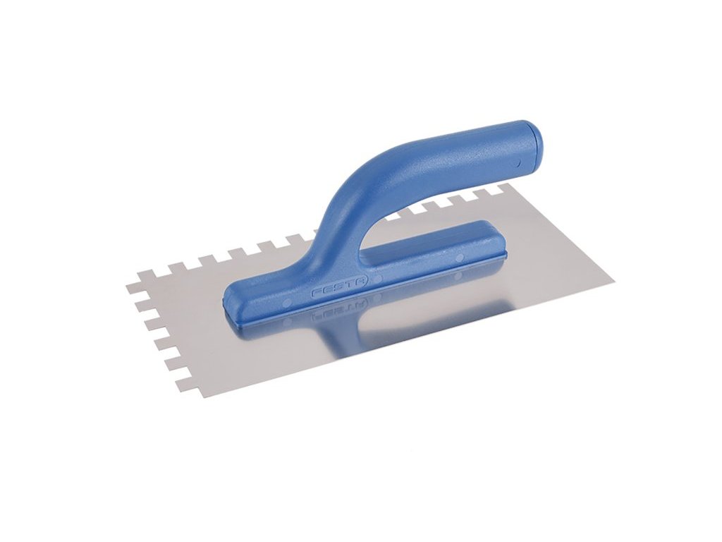 Hladítko nerezové zubové FESTA 280x130 mm, zub e10, s plastovou ručkou, tl.plechu 0,8 mm. Používá se zejména k nanášení lepidel pod obklady a dlažby, dále pak k nanášení stěrek, štuků, omítek, tmelů a dalších stavebních hmot. Hladítko nerezové zubové umožní natáhnout lepidlo či stavební hmotu v pruzích a výšce dle zubu hladítka.
