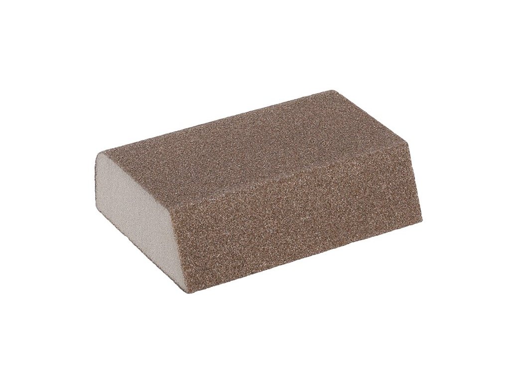 brusná houba zkosená 45°, zaoblená molitanový základ, vhodné pro různé povrchy a materiály - broušení dřeva, kovů, sádrových omítek, tmelů apod. a to jak za sucha, tak i za mokra speciální tvar houby vhodný k renovaci nábyku, oken, dveří, broušení v hůře přístupných místech apod. rozměry - 100 x 70 x 25 mm