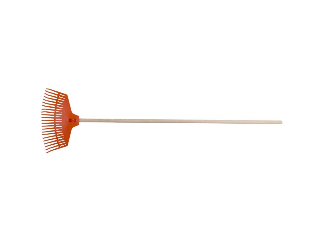 Plastové hrábě pro hrabání listí, trávy nebo také plsti po vertikutaci, 23 plastových zubů (lamel). S dřevěnou násadou 160 cm.