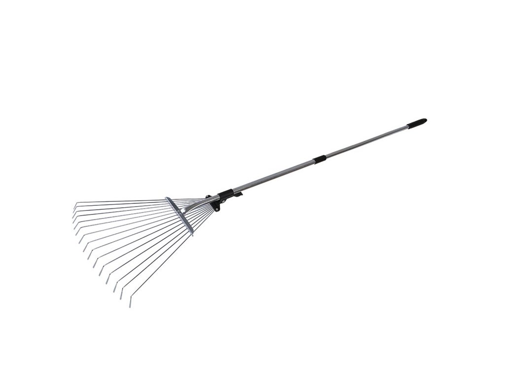 Švédské hrábě s kovovým klipem - pojistkou, nastavitelná rozteč lamel, teleskopická rukojeť, použití : k hrabání listí, trávy.