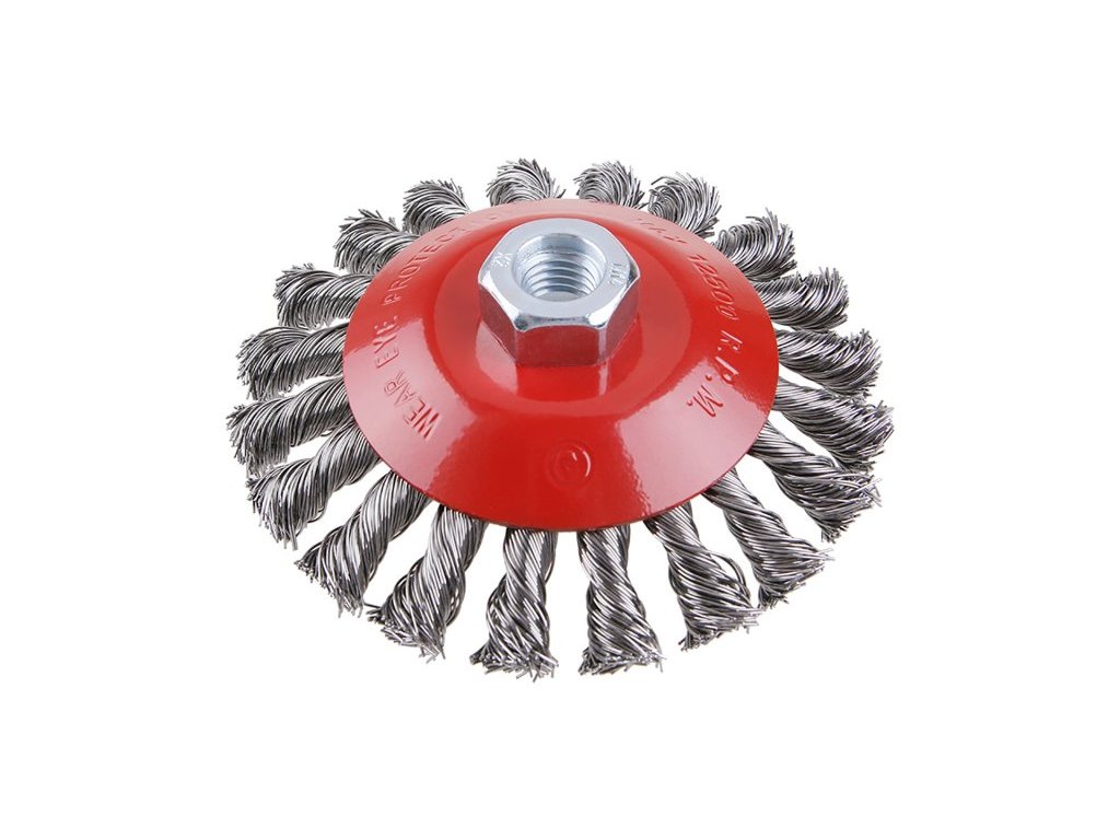 Rotační kartáč - miskový, provedení : COPY - patentovaný drát 0,5 mm - copy, se ani při extrémním zatížení nerozplétají, průměr 115mm, závit M14x2 mm, počet drátů: 900, délka drátu : 23 mm, max. přípustné otáčky: 12500 1/min, použití : odstranění barvy, rzi, otřepů, zbytků po svařovení, strusky, zdrsňování, čištění kovoých součástí Instruktážní video
