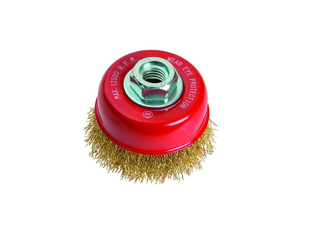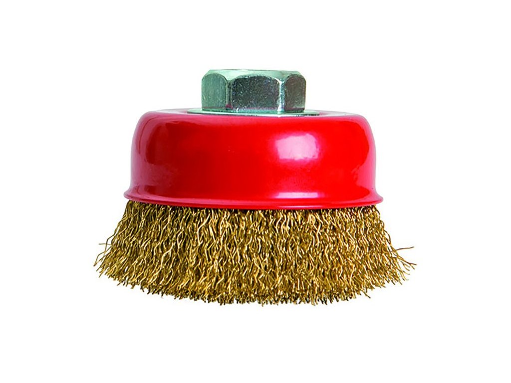 Kartáč miskový s mosaznými vlnitými drátky, uchycení M14, hrnkový, vhodné pro nerezové materiály. Instruktážní video