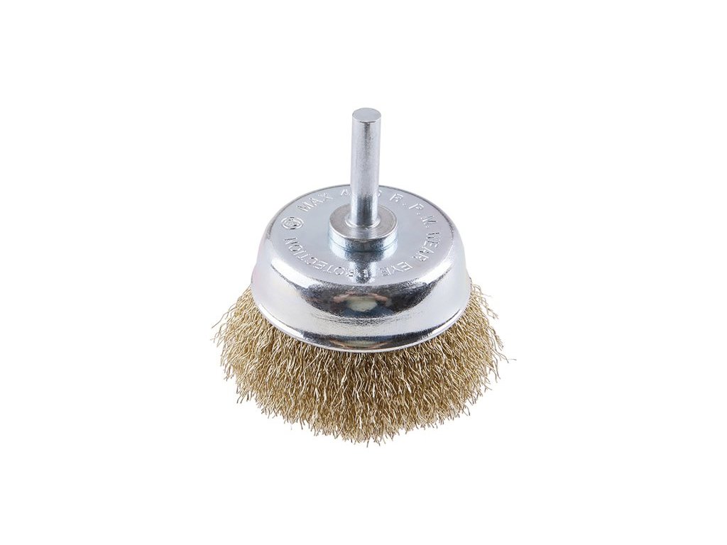 Rotační kartáč - hrnkový, provedení : vlnitý drát 0,25 mm - pomosazený, průměr 65mm, stopka 6 x 27 mm, pozinkované tělo kartáče, počet drátů : 1512, délka drátu : 18,5 mm, max. přípustné otáčky : 4500 1/min, použití : pro leštění, zdrsňování, ostranění rzi a otřepů, balení : blistr s eurootvorem.