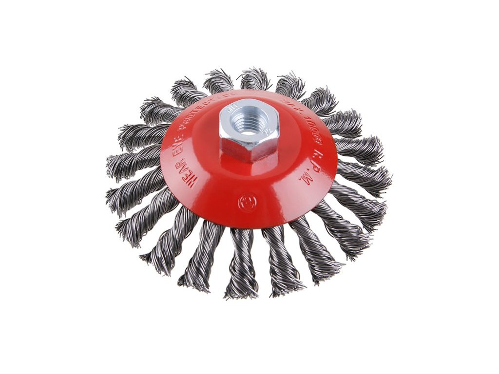 Rotační kartáč - miskový, provedení : COPY - patentovaný drát 0,5 mm - copy, se ani při extrémním zatížení nerozplétají, průměr 125mm, závit M14x2 mm, počet drátů: 900, délka drátu : 23 mm, max. přípustné otáčky: 12500 1/min, použití : odstranění barvy, rzi, otřepů, zbytků po svařovení, strusky, zdrsňování, čištění kovoých součástí Instruktážní video