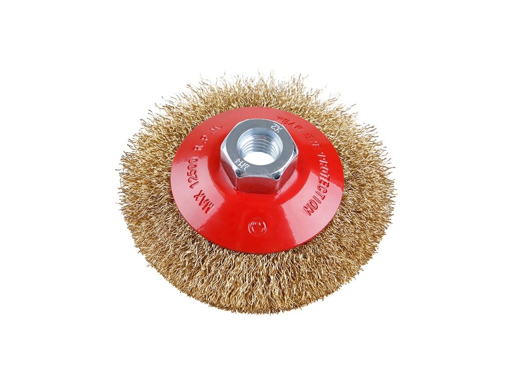 Rotační kartáč - miskový, kartáč FESTA zaručují kvalitní použité materiály i zpracování, vlnitý drát - pomosazený 0,3mm, průměr 100mm, uchycení M14, počet drátů 1800, maximální otáčky za min. 12500, použití : pro odstranění rzi, barvy, leštění . Instruktážní video