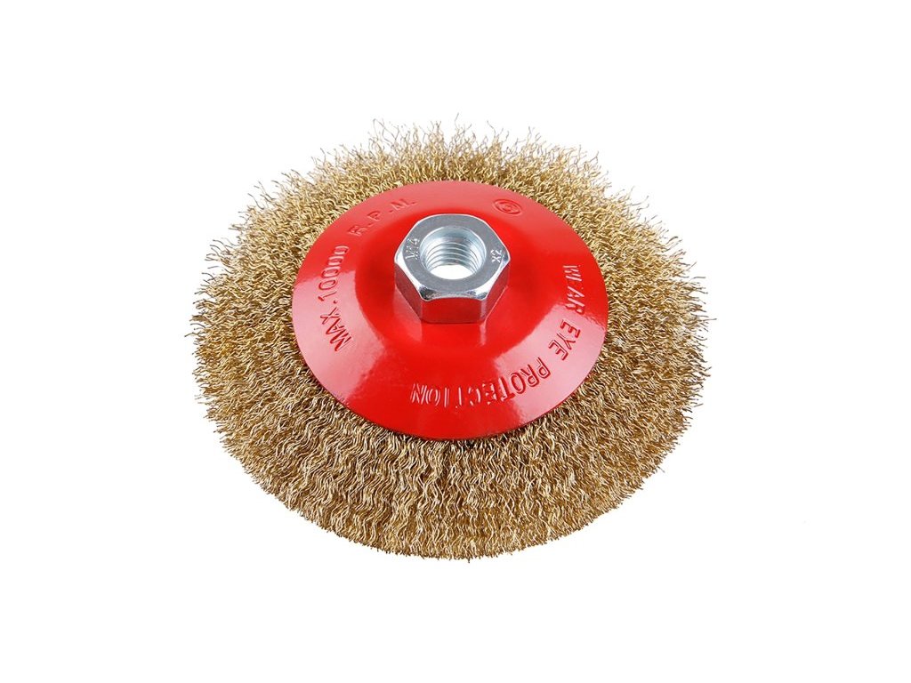Rotační kartáč - miskový, kartáč FESTA zaručují kvalitní použité materiály i zpracování, vlnitý drát - pomosazený 0,3mm, průměr 125mm, uchycení M14, počet drátů 1800, maximální otáčky za min. 12500, použití : pro odstranění rzi, barvy, leštění . Instruktážní video