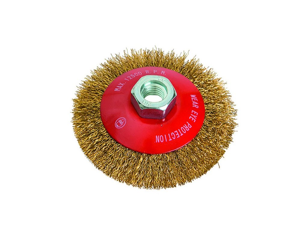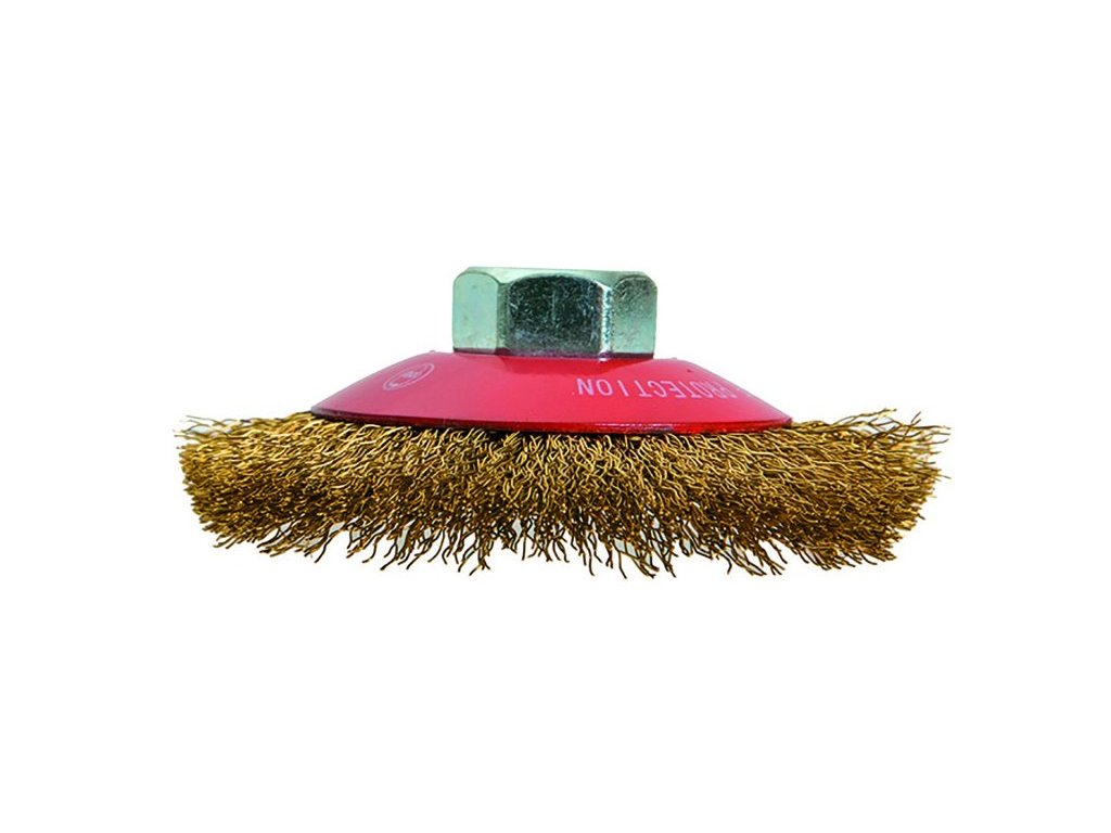 Kartáč miskový s mosaznými vlnitými drátky, uchycení M14, miskový, vhodné pro nerezové materiály. Instruktážní video