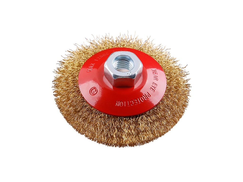 Rotační kartáč - miskový, kartáč FESTA zaručují kvalitní použité materiály i zpracování, vlnitý drát - pomosazený 0,3mm, průměr 100mm, uchycení M14*2, počet drátů 1800, délka drátů 19mm, maximální otáčky za min. 12500, použití : pro odstranění rzi, barvy, leštění …, balení : papírový box s eurootvorem. Instruktážní video