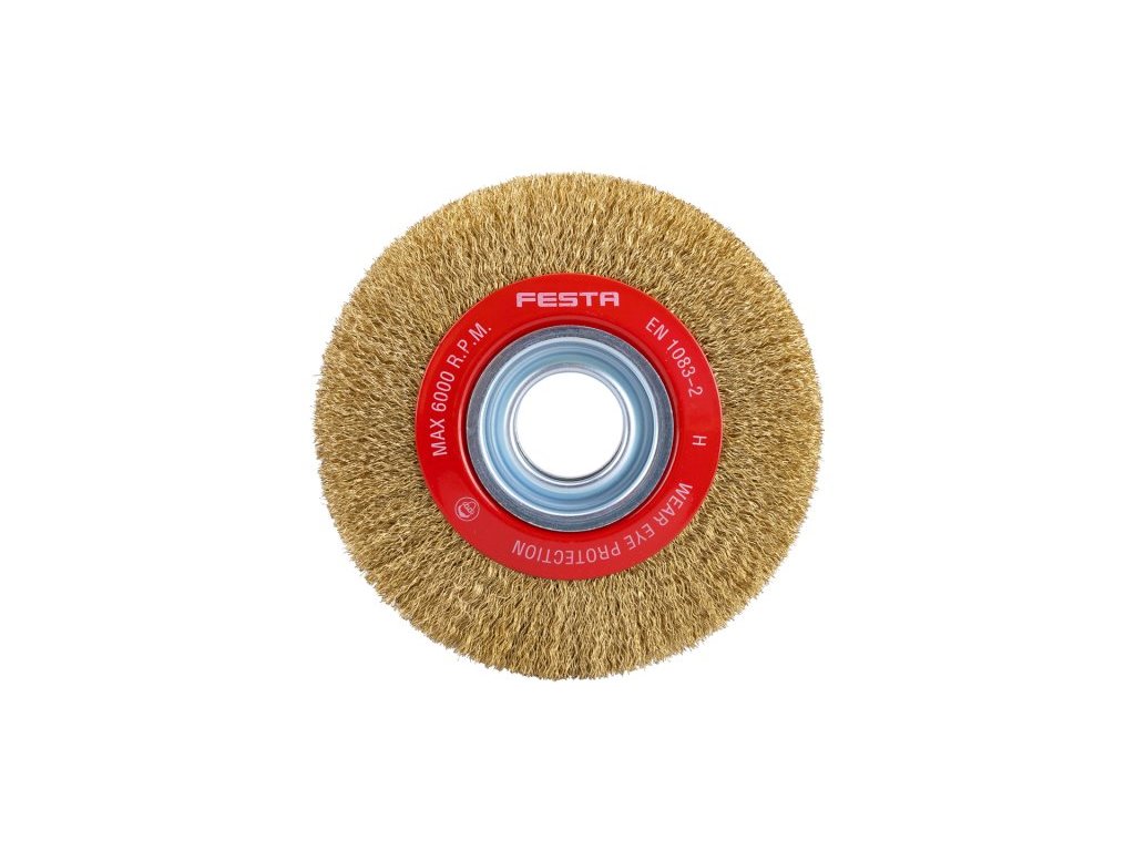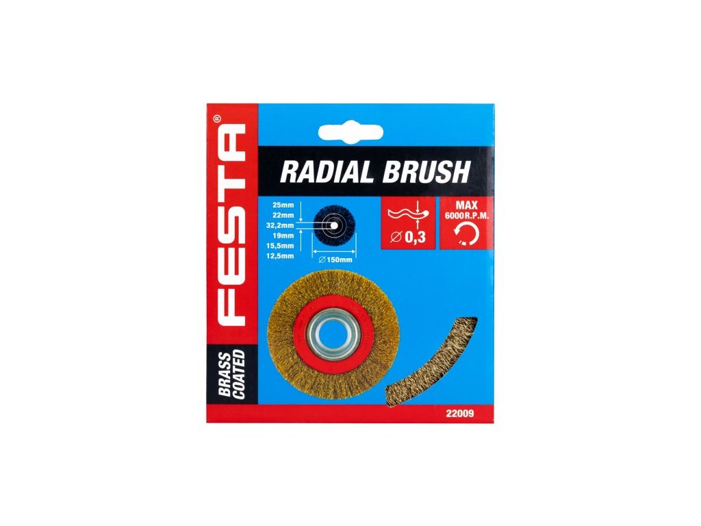 Rotační kartáč - okružní, provedení : vlnitý drát, kartáče FESTA zaručují kvalitní použité materiály i zpracování, drát 0,3 mm - pomosazený, průměr 150 mm, uchycení otvor 32 mm (včetně redukčních kroužků 12,7mm - 1/2, 15,8 mm - 5/8, 19 mm - 3/4, 22,2 mm a 25,4 mm - 1), počet drátů 7200, délka drátů 30mm, maximální otáčky za min. 6000, vhodný pro zámečnické a kovoobráběcí práce, odstraňování rzi, barev, leštění.… , balení : papírový box.