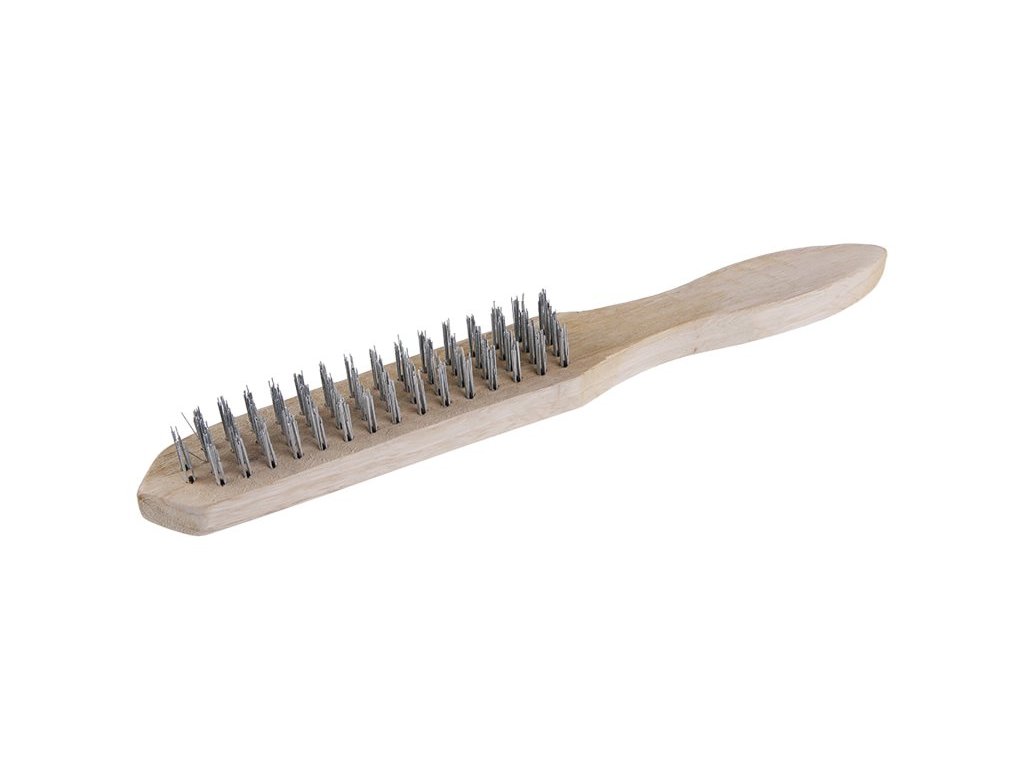 Ocelový kartáč - ruční, ocelový drát - pozinkovaný, dřevěvěné tělo, délka 300 mm, ergonomicky upravená rukojeť, 4 řady, počet drátů : 960, použití: k číštění železných kovů jako je ocel, nerez, litina, zdrsnění, a hrubé odstranění starých nátěrů, ….