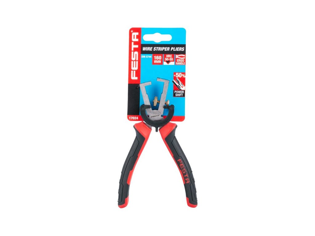 Odizolovávací kleště FESTA 160mm, stavitelné čelisti pro snadné odizolovávání vodičů, ergonomické rukojeti s certifikací pro práci do 1000 V, výrobce je držitelem certifikátu ISO 9001, blistr.