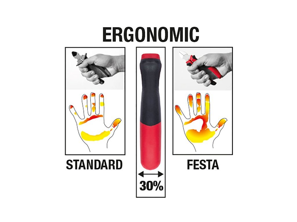 Vysoce kvalitní kleště. Antikorozní úprava. Ergonomické dvoukomponentní měkčené rukojeti. O 30% více kontaktu s rukojetí, redukuje množství potřebné síly. Výrobce je držitelem certifikátu ISO 90001. HRC 58-62.
