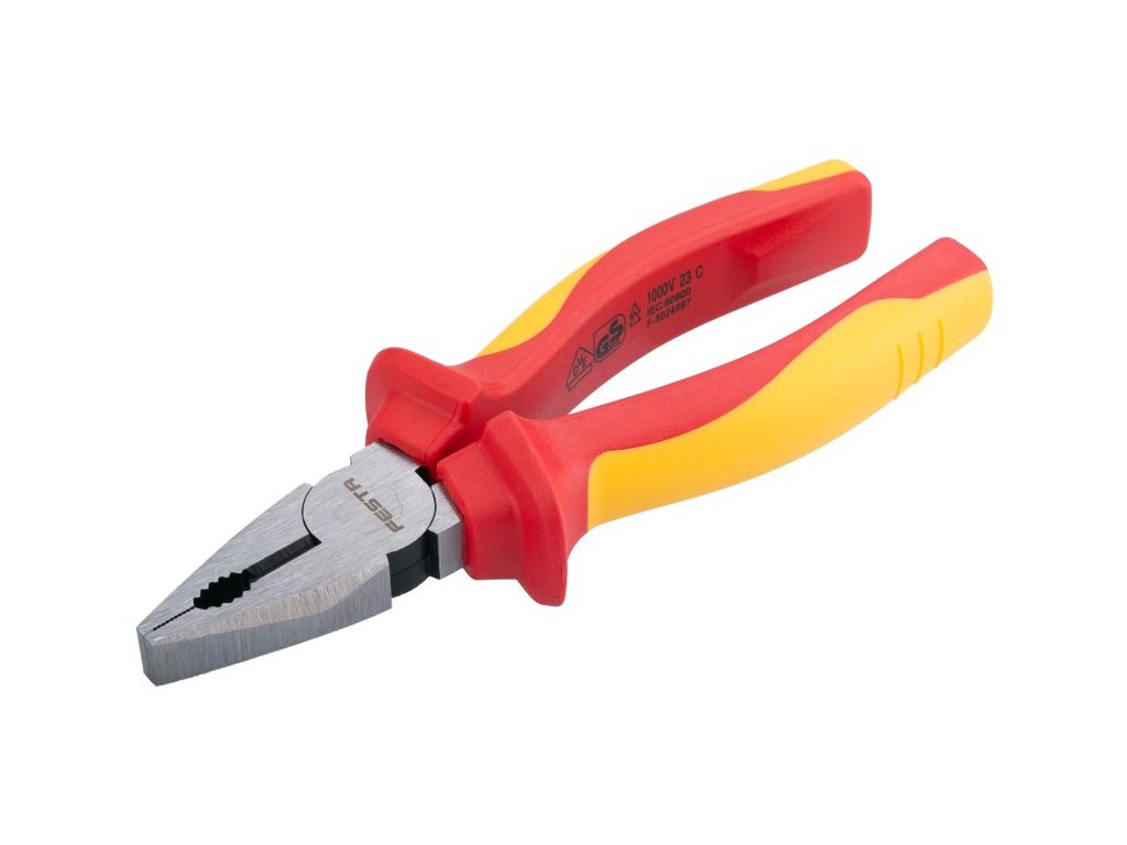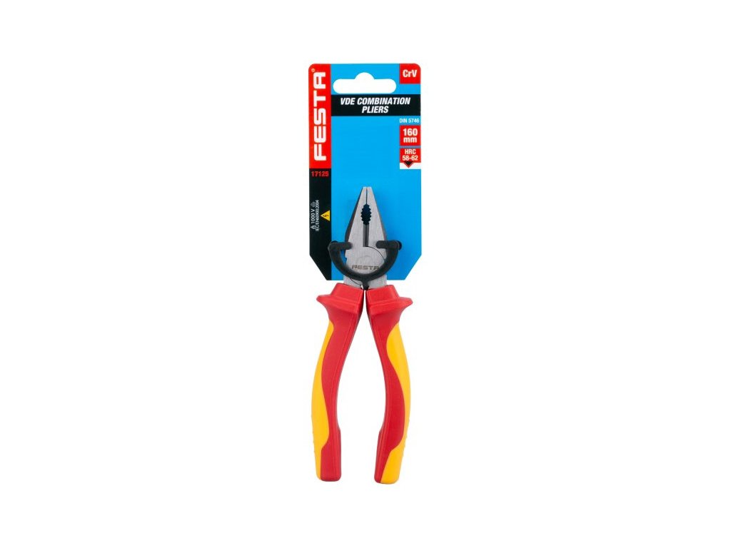 Kleště VDE kombinované 160 mm FESTA mají certifikaci elektro VDE 1000 V, IEC/EN 60900-2004, kombinace polypropylenu a pryže na ergonomicky tvarovaných ručkách zaručuje výborné antiskluzové vlastnosti a dobrou odolnost vůči mazadlům a chemikáliím. Uchopovací čelisti obzvláště odolné proti opotřebení, chromvanadová vysoce výkonná ocel. Hmotnost 0,283 kg.