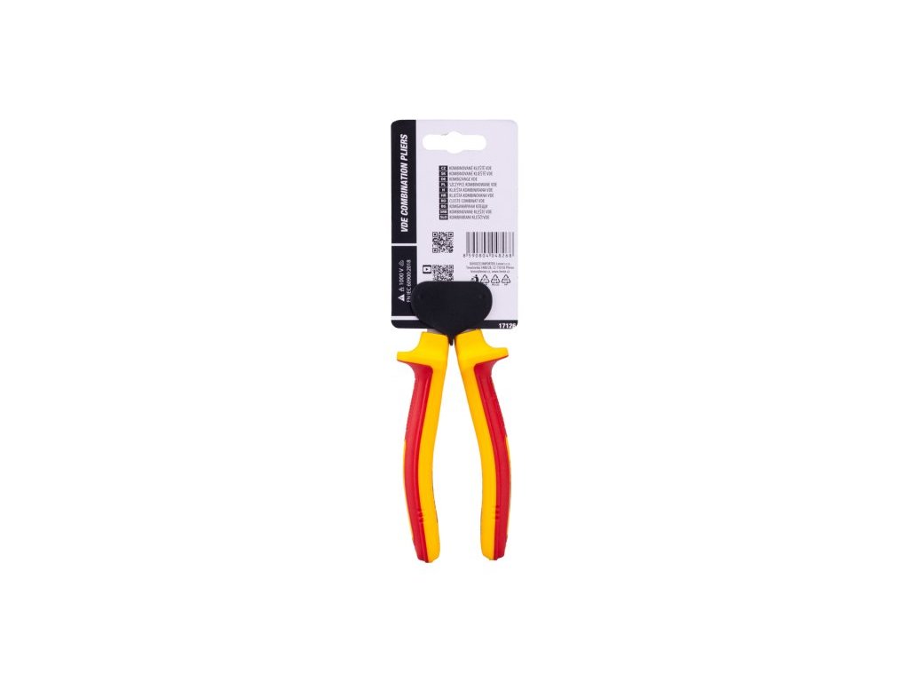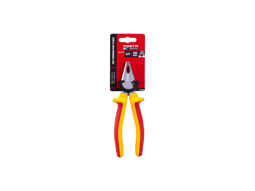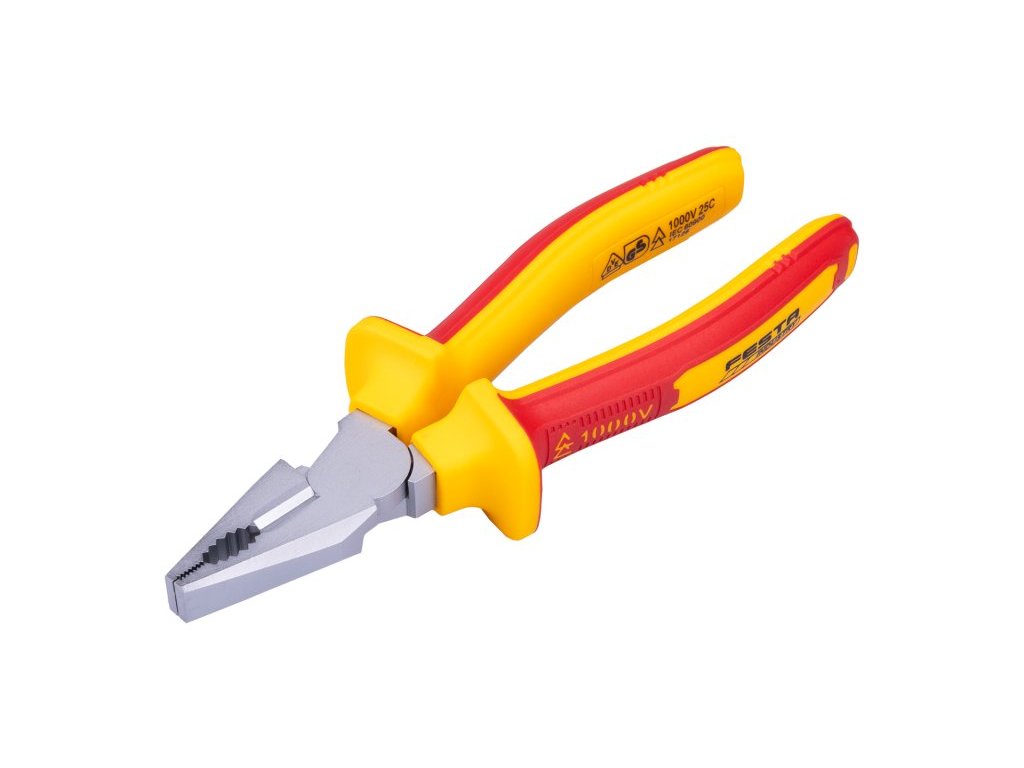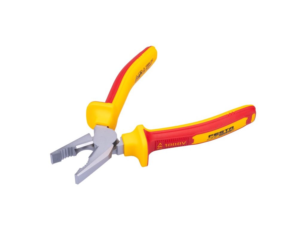 Kleště VDE kombinované 180 mm FESTA mají certifikaci elektro VDE 1000 V, IEC/EN 60900-2004, kombinace polypropylenu a pryže na ergonomicky tvarovaných ručkách zaručuje výborné antiskluzové vlastnosti a dobrou odolnost vůči mazadlům a chemikáliím. Uchopovací čelisti obzvláště odolné proti opotřebení, chromvanadová vysoce výkonná ocel. Hmotnost 0,333 kg.