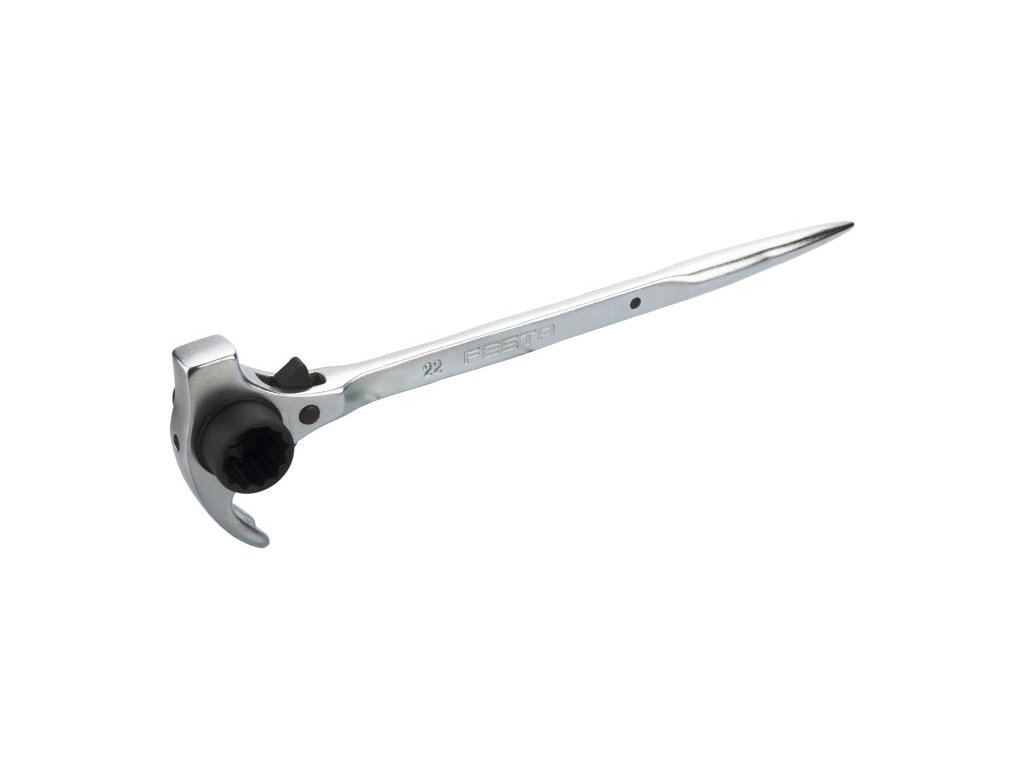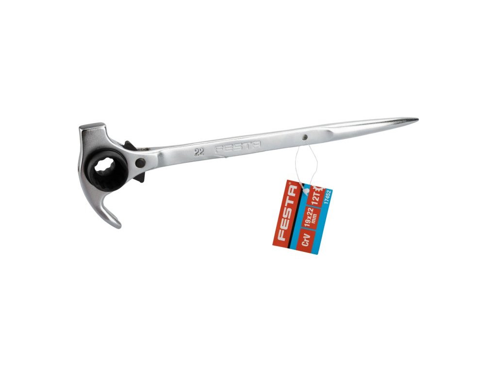 lešenářský multifunkční klíč s ráčnou 19 a 22 mm, vhodný zejména na montáž a demontáž lešení