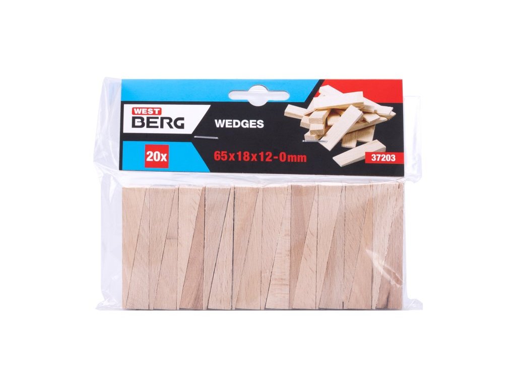 Dřevěné klínky (buk,dub), rozměr : 65 x 18 x 0-12 mm, množství : 20 ks, použití : pro osazování oken, zárubní a kovových konstrukcí, balení : blistr s eurootvorem.