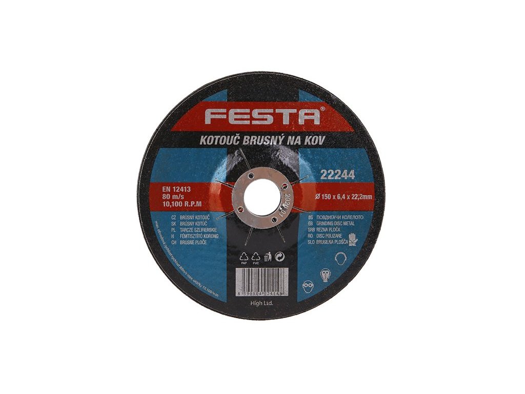 Druh Zrna: Korund Pojivo: Syntetické pryskyřice na bázi aldehydu Provedení: Vyhnutý Max. Pracovní rychlost: 80m/s Max. přípustné otáčky: 10200 1/min Pro zvýšení pevnosti armováno třívrstvou sklotextilní vložkou.