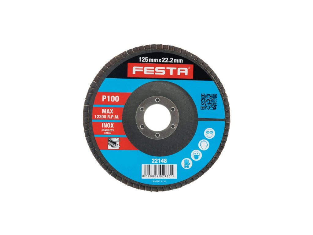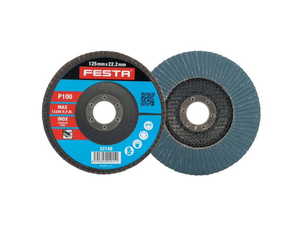 Zrnitost: 100 Druh Zrna: oxid zirkoničitý Pojivo: umělá pryskyřice Podkladový materiál: pružná tkanina-100% bavlna (240-260g/m2) Provedení: vyhnutý vnitřní průměr: 22,2mm Max. Pracovní rychlost: 80m/s Max. přípustné otáčky: 12200 1/min.