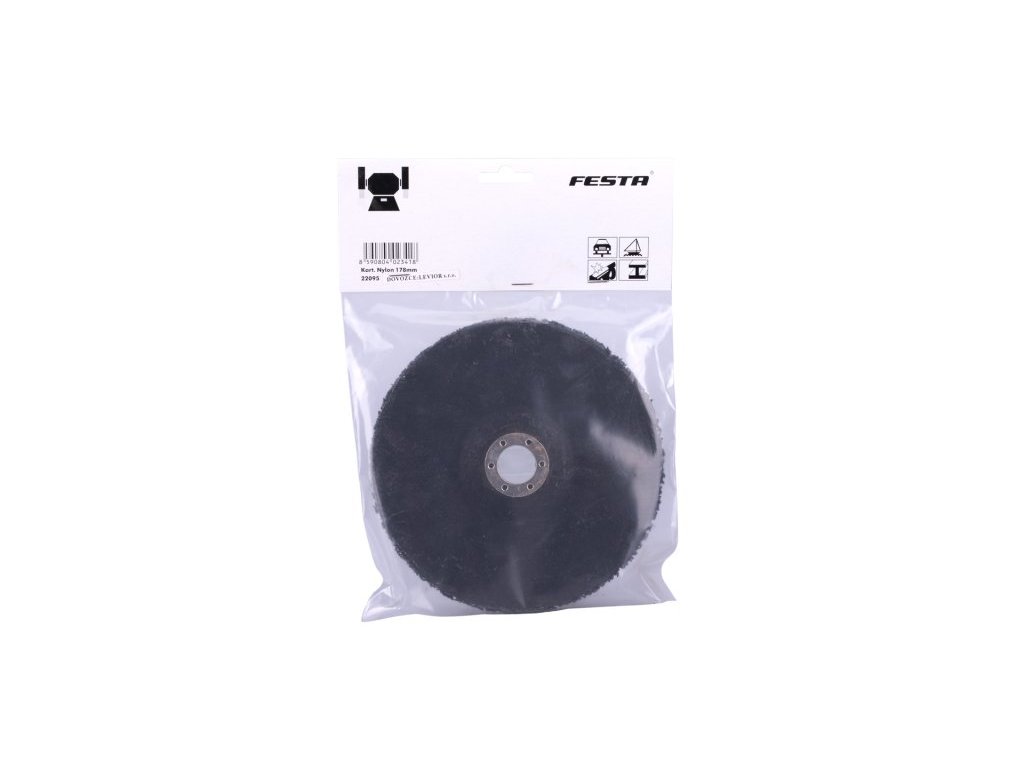 Nylonový brousící kotouč, podložka : sklotextilie, druh zrna: karbid křemíku / nylon, pojivo : pryskyřice, průměr : 178 mm, použití : odstranění starých nátěrů, broušení, čištění, balení : blistr s eurootvorem.