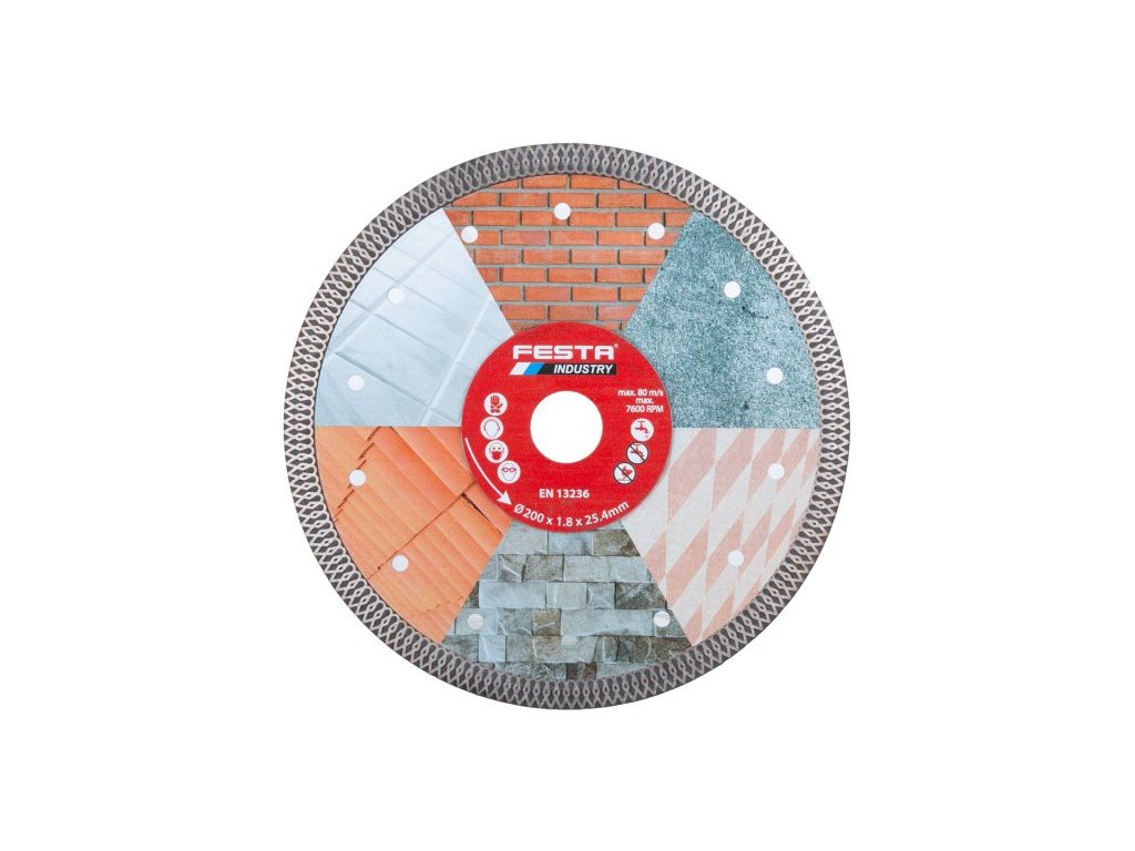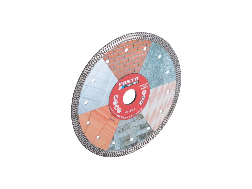 profesionální diamantový turbo kotouč FESTA INDUSTRY - extra tenký jen 2 mm kvalitní diamantová vrstva se speciálním tvarem segmentů a vysokým obsahem diamantového prachu -rychlé a přesné řezání, dlouhá životnost přesné zpracování - napojení na nosný disk kotouče odolávající vysokým teplotám, chladící otvory v těle kotouče pro maximální chlazení kotouče při práci, zesílený střed - vyšší pevnost konstrukce kotouče s nižším přenosem nežádoucích vibrací určený pro mokré i suché řezání dlažby, obkladů, keramiky, porcelánu, skla, betonu, cihel, zdiva, žuly, mramoru, kamene