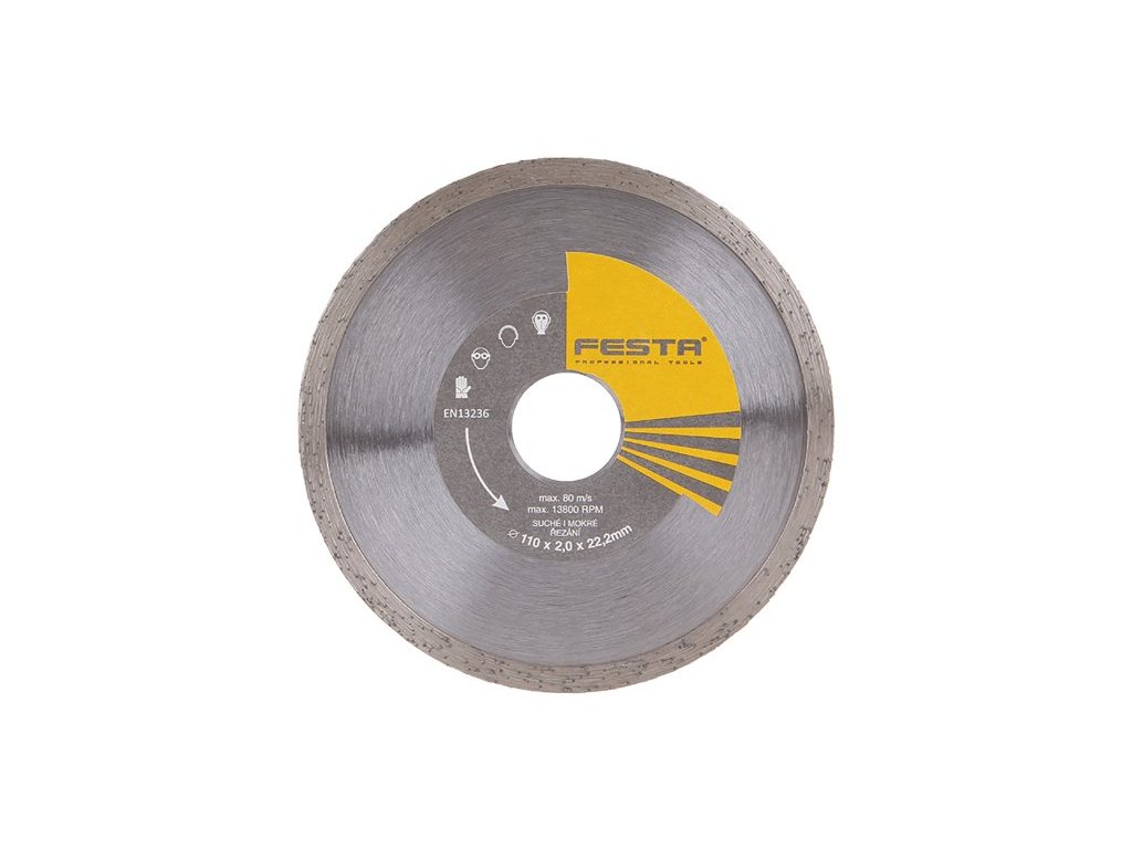 Profesionální diamantový kotouč FESTA, provedení : PLNÝ - celoobvodový, kvalitní diamantová vrstva s vysokým obsahem diamantového prachu, přesné zpracování - napojení na nosný disk kotouče odolávající vysokým teplotám, použití : určený pro mokré i suché řezání dlažby a obkladů, betonu, cihel, zdiva, žuly, mramoru, kamene, skla, keramiky, balení : blistr s eurootvorem, rozměry : uvedeny v názvu výrobku. Instruktážní video