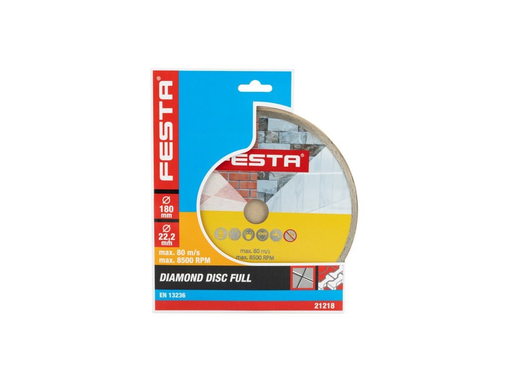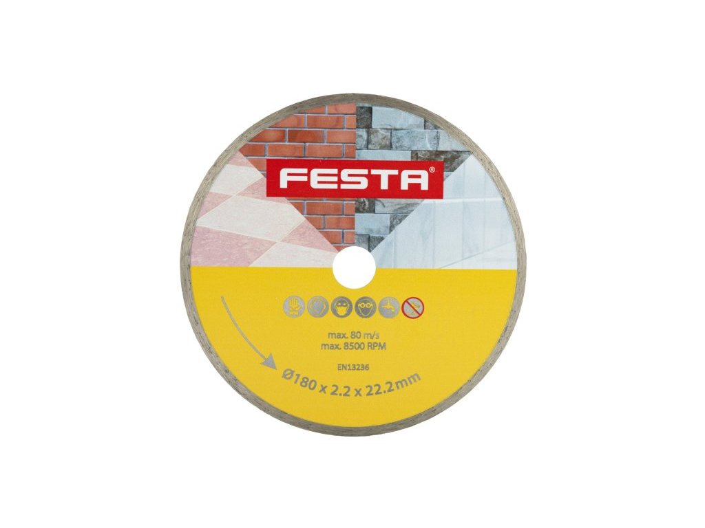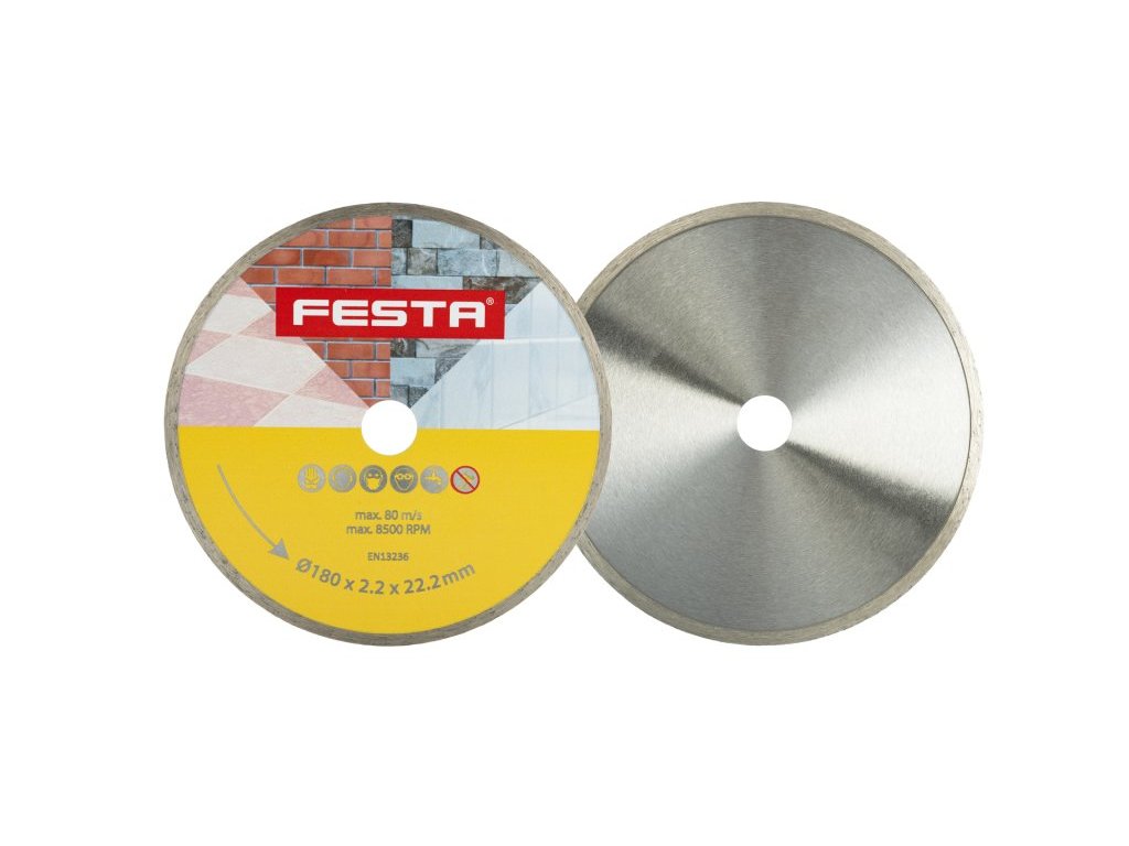 Profesionální diamantový kotouč FESTA, provedení : PLNÝ - celoobvodový, kvalitní diamantová vrstva s vysokým obsahem diamantového prachu, přesné zpracování - napojení na nosný disk kotouče odolávající vysokým teplotám, použití : určený pro mokré i suché řezání dlažby a obkladů, betonu, cihel, zdiva, žuly, mramoru, kamene, skla, keramiky, balení : blistr s eurootvorem, rozměry : uvedeny v názvu výrobku.