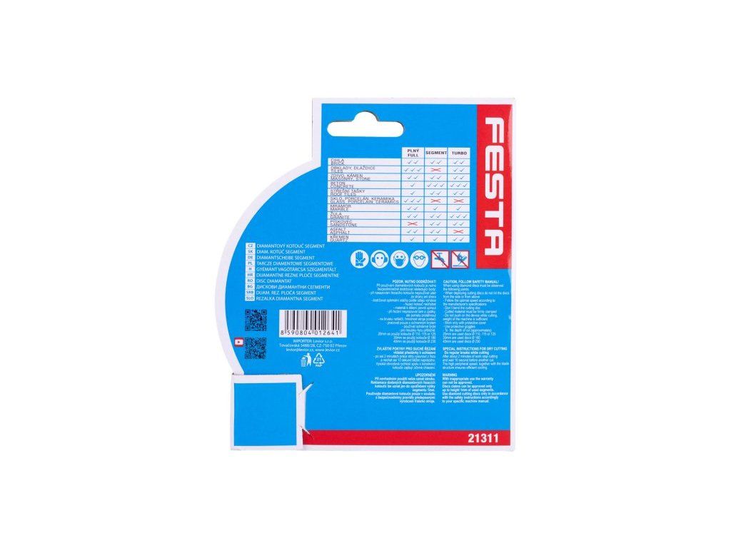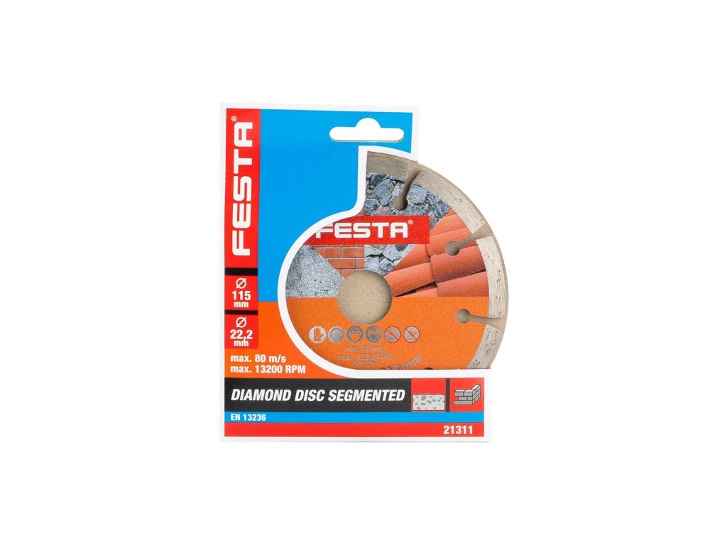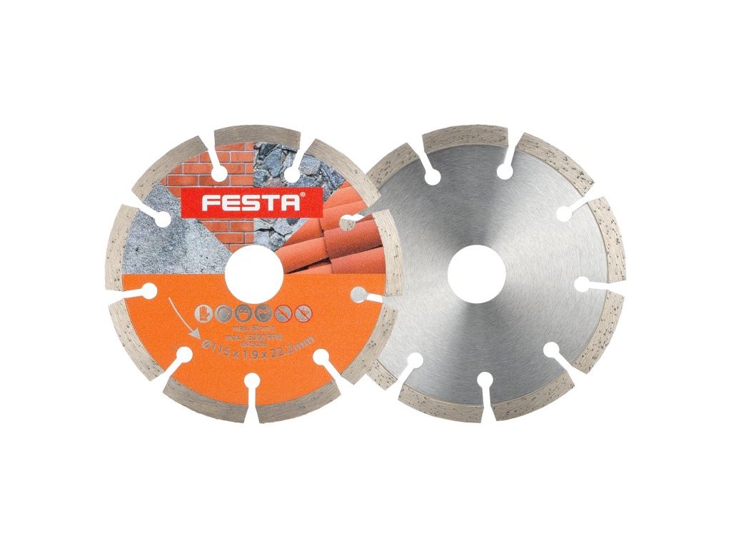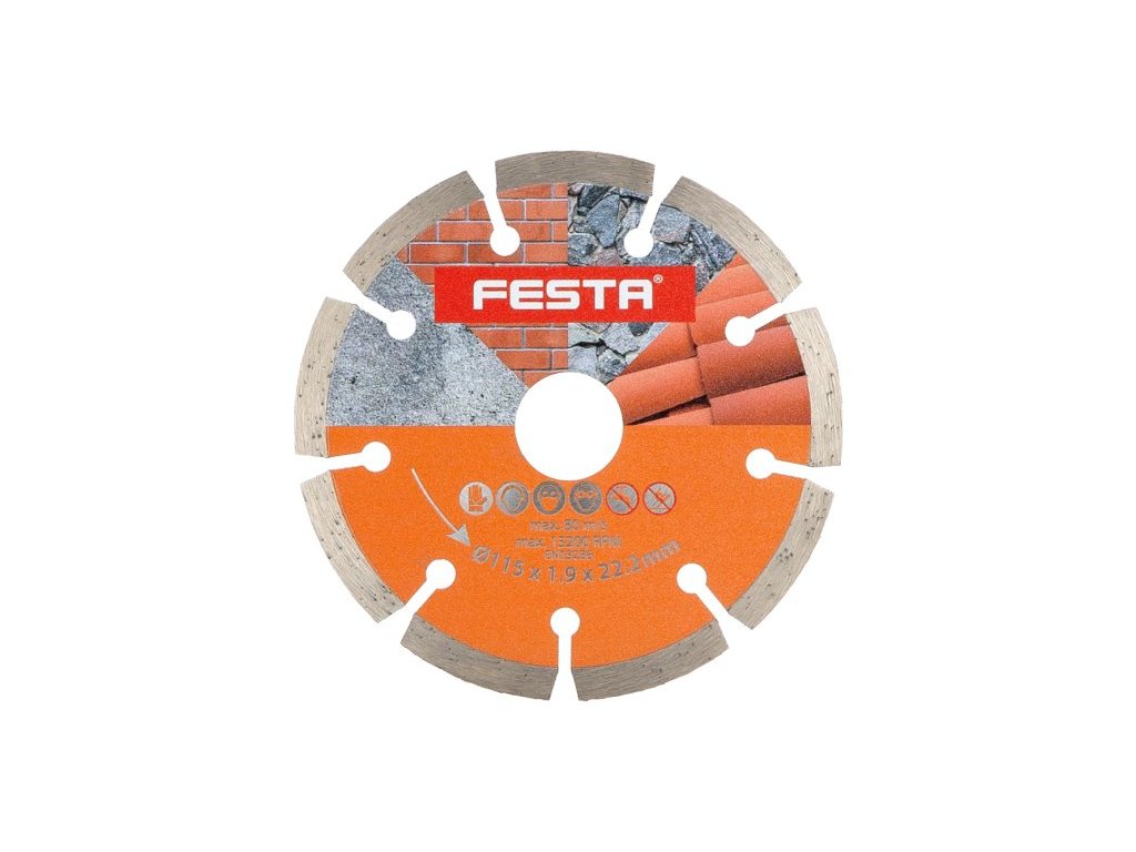 Profesionální diamantový kotouč FESTA, provedení : SEGMENTOVÝ, kvalitní materiály i zpracování - vysoce pevné uchycení diamantových segmentů k nosnému disku kotouče, vysoký obsah diamantového prachu v segmentech, použití : pro suché řezání betonu, cihel, zdiva, kamene, ... , balení : blistr s eurootvorem, rozměry : uvedeny v názvu výrobku. Instruktážní video