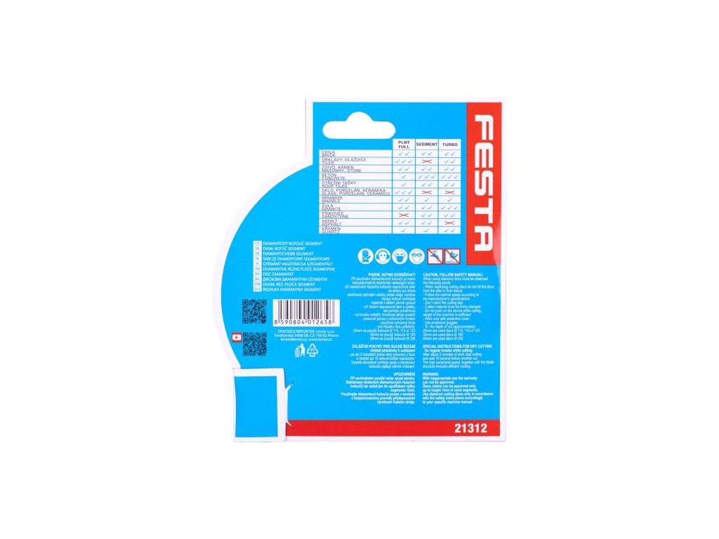 Profesionální diamantový kotouč FESTA, provedení : SEGMENTOVÝ, kvalitní materiály i zpracování - vysoce pevné uchycení diamantových segmentů k nosnému disku kotouče, vysoký obsah diamantového prachu v segmentech, použití : pro suché řezání betonu, cihel, zdiva, kamene, ... , balení : blistr s eurootvorem, rozměry : uvedeny v názvu výrobku. Instruktážní video
