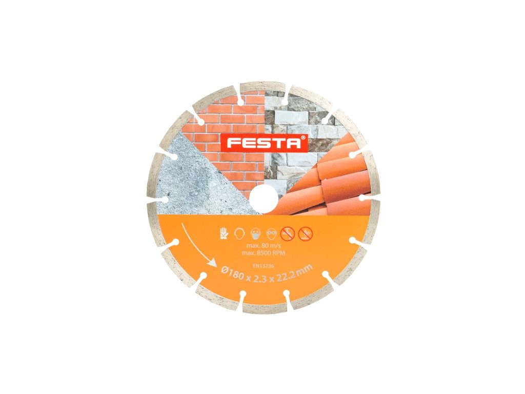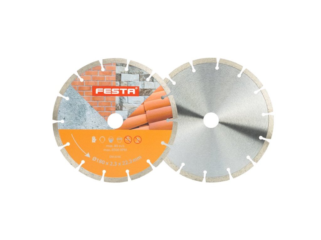 Profesionální diamantový kotouč FESTA, provedení : SEGMENTOVÝ, kvalitní materiály i zpracování - vysoce pevné uchycení diamantových segmentů k nosnému disku kotouče, vysoký obsah diamantového prachu v segmentech, použití : pro suché řezání betonu, cihel, zdiva, kamene, ... , balení : blistr s eurootvorem, rozměry : uvedeny v názvu výrobku.