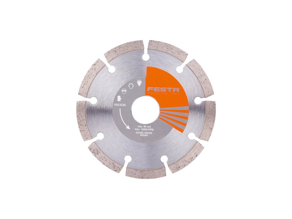 Profesionální diamantový kotouč FESTA, provedení : SEGMENTOVÝ, kvalitní materiály i zpracování - vysoce pevné uchycení diamantových segmentů k nosnému disku kotouče, vysoký obsah diamantového prachu v segmentech, použití : pro suché řezání betonu, cihel, zdiva, kamene, ... , balení : blistr s eurootvorem, rozměry : uvedeny v názvu výrobku.