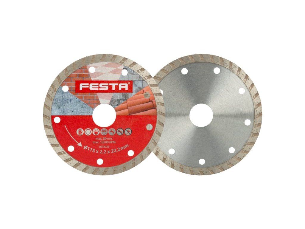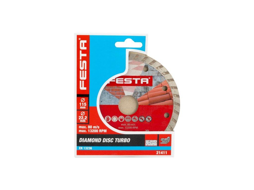 Diamantový kotouč FESTA, provedení : TURBO, kvalitní materiály i zpracování, speciální tvar diamantových segmentů i konstrukce a pevné uchycení k nosnému disku kotouče, vysoký obsah diamantového prachu, použití : pro suché i mokré řezání betonu, železobetonu, cihel, zdiva, kamene, balení : blistr s eurootvorem, rozměry : uvedeny v názvu výrobku. Instruktážní video