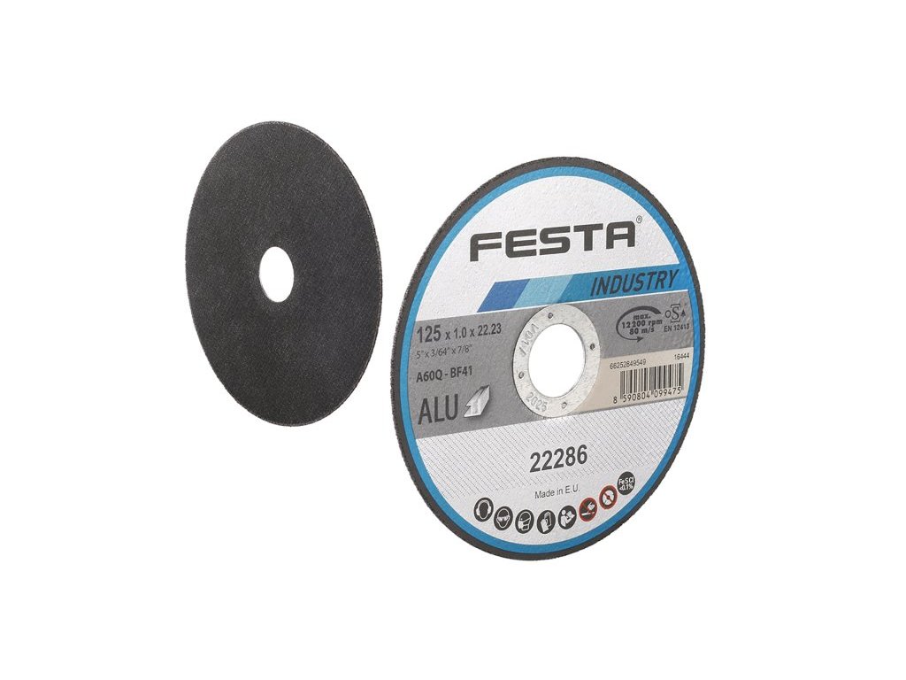 profesionální řezný kotouč na hliník řada kotoučů FESTA INDUSTRY je, jak již z názvu vyplývá určena zejména pro profesionální použití, kvalita ověřená reálnými zkouškami zaměřenými na počet a rychlost řezů, výrobcem je jeden z největších evropských výrobců abrasiv druh zrna - OXID hlinitý, pojivo - fenolová pryskyřice, provedení - ROVNÝ, max. pracovní rychlost - 80 m/s, max. přípustné otáčky - 12200 ot/min, PRO ZVÝŠENÍ PEVNOSTI ARMOVÁNO DVOUVRSTVOU SKLOTEXTILNÍ VLOŽKOU KOTOUČE FESTA INDUSTRY SPLNUJÍ EN 12413 a homologaci OSA Instruktážní video
