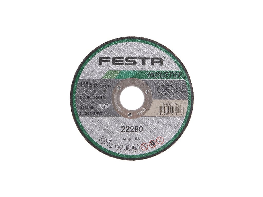Profesionální řezný kotouč na přírodní i umělý kámen, vyrobeno v EVROPĚ!, řada kotoučů FESTA INDUSTRY je, jak již z názvu vyplývá určena zejména pro profesionální použití, kvalita ověřená reálnými zkouškami zaměřenými na počet a rychlost řezů. Druh zrna - KARBID KŘEMÍKU, pojivo - syntetické pryskyřice na bázi aldehydu, provedení - ROVNÝ, max. pracovní rychlost - 80 m/s, max. přípustné otáčky - 6600 ot/min, PRO ZVÝŠENÍ PEVNOSTI ARMOVÁNO DVOUVRSTVOU SKLOTEXTILNÍ VLOŽKOU! KOTOUČE FESTA INDUSTRY SPLNUJÍ EN 12413 a homologaci OSA!