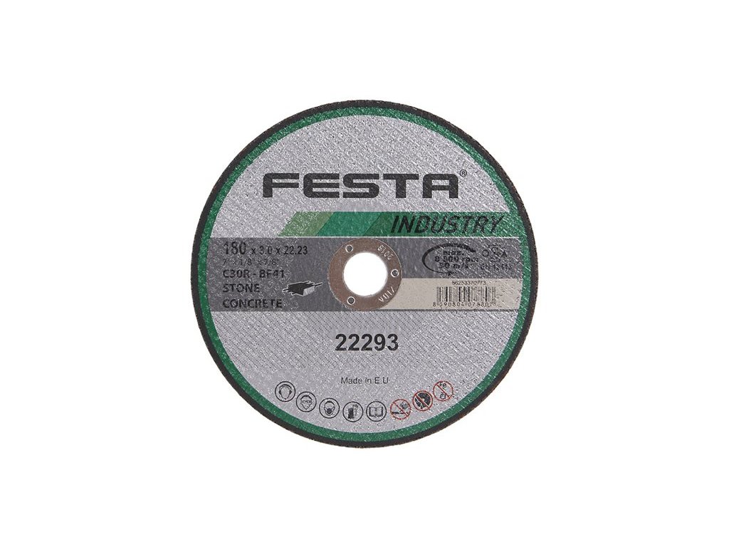 Profesionální řezný kotouč na přírodní i umělý kámen, vyrobeno v EVROPĚ!, řada kotoučů FESTA INDUSTRY je, jak již z názvu vyplývá určena zejména pro profesionální použití, kvalita ověřená reálnými zkouškami zaměřenými na počet a rychlost řezů. Druh zrna - KARBID KŘEMÍKU, pojivo - syntetické pryskyřice na bázi aldehydu, provedení - ROVNÝ, max. pracovní rychlost - 80 m/s, max. přípustné otáčky - 6600 ot/min, PRO ZVÝŠENÍ PEVNOSTI ARMOVÁNO DVOUVRSTVOU SKLOTEXTILNÍ VLOŽKOU! KOTOUČE FESTA INDUSTRY SPLNUJÍ EN 12413 a homologaci OSA!