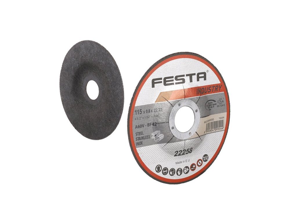 profesionální extra tenký řezný kotouč na NEREZ, ocel, litinu řada kotoučů FESTA INDUSTRY je, jak již z názvu vyplývá určena zejména pro profesionální použití, kvalita ověřená reálnými zkouškami zaměřenými na počet a rychlost řezů, výrobcem je jeden z největších evropských výrobců abrasiv druh zrna - KORUND, pojivo - syntetické pryskyřice na bázi aldehydu, provedení - ROVNÝ, max. pracovní rychlost - 80 m/s, max. přípustné otáčky - 12200 ot/min, PRO ZVÝŠENÍ PEVNOSTI ARMOVÁNO DVOUVRSTVOU SKLOTEXTILNÍ VLOŽKOU KOTOUČE FESTA INDUSTRY SPLNUJÍ EN 12413 a homologaci OSA Instruktážní video