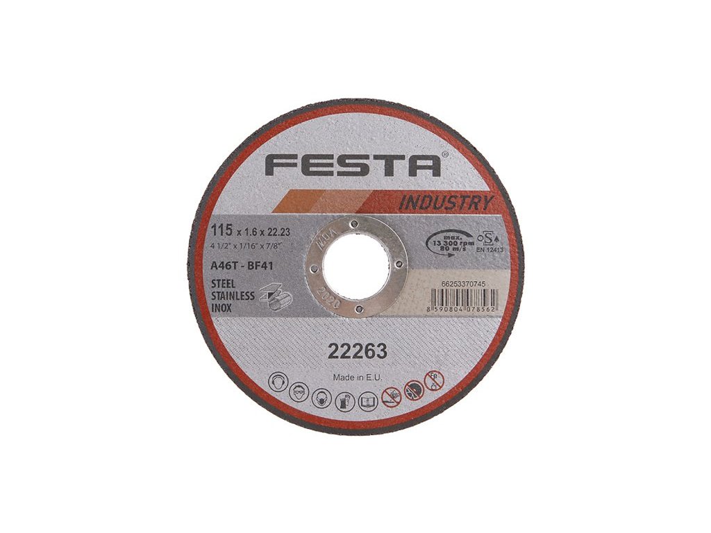 Profesionální řezný kotouč na kov, litinu, NEREZ. Vyrobeno v EVROPĚ!, řada kotoučů FESTA INDUSTRY je, jak již z názvu vyplývá určena zejména pro profesionální použití, kvalita ověřená reálnými zkouškami zaměřenými na počet a rychlost řezů. Druh zrna - KORUND, pojivo - syntetické pryskyřice na bázi aldehydu, provedení - ROVNÝ, max. pracovní rychlost - 80 m/s, max. přípustné otáčky - 12200 ot/min, PRO ZVÝŠENÍ PEVNOSTI ARMOVÁNO DVOUVRSTVOU SKLOTEXTILNÍ VLOŽKOU! KOTOUČE FESTA INDUSTRY SPLNUJÍ EN 12413 a homologaci OSA! Instruktážní video