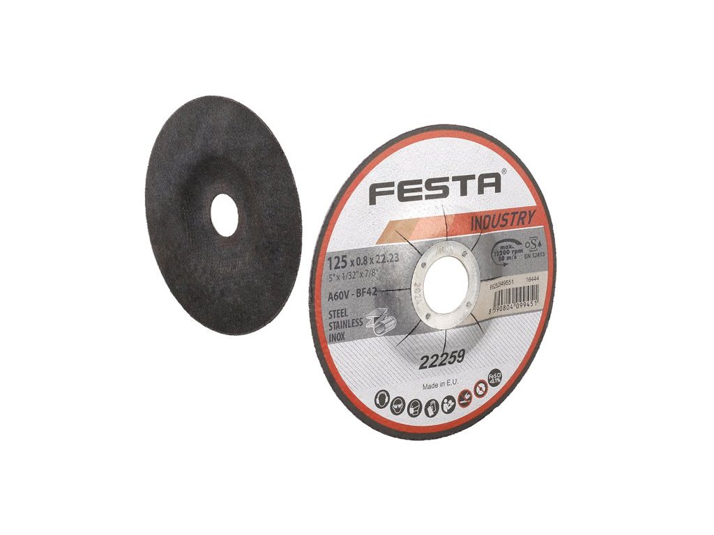 profesionální extra tenký řezný kotouč na NEREZ, ocel, litinu řada kotoučů FESTA INDUSTRY je, jak již z názvu vyplývá určena zejména pro profesionální použití, kvalita ověřená reálnými zkouškami zaměřenými na počet a rychlost řezů, výrobcem je jeden z největších evropských výrobců abrasiv druh zrna - KORUND, pojivo - syntetické pryskyřice na bázi aldehydu, provedení - ROVNÝ, max. pracovní rychlost - 80 m/s, max. přípustné otáčky - 12200 ot/min, PRO ZVÝŠENÍ PEVNOSTI ARMOVÁNO DVOUVRSTVOU SKLOTEXTILNÍ VLOŽKOU KOTOUČE FESTA INDUSTRY SPLNUJÍ EN 12413 a homologaci OSA Instruktážní video