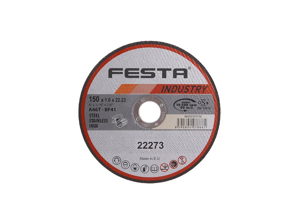 Profesionální řezný kotouč na kov, litinu, NEREZ. Vyrobeno v EVROPĚ!, řada kotoučů FESTA INDUSTRY je, jak již z názvu vyplývá určena zejména pro profesionální použití, kvalita ověřená reálnými zkouškami zaměřenými na počet a rychlost řezů. Druh zrna - KORUND, pojivo - syntetické pryskyřice na bázi aldehydu, provedení - ROVNÝ, max. pracovní rychlost - 80 m/s, max. přípustné otáčky - 12200 ot/min, PRO ZVÝŠENÍ PEVNOSTI ARMOVÁNO DVOUVRSTVOU SKLOTEXTILNÍ VLOŽKOU! KOTOUČE FESTA INDUSTRY SPLNUJÍ EN 12413 a homologaci OSA!