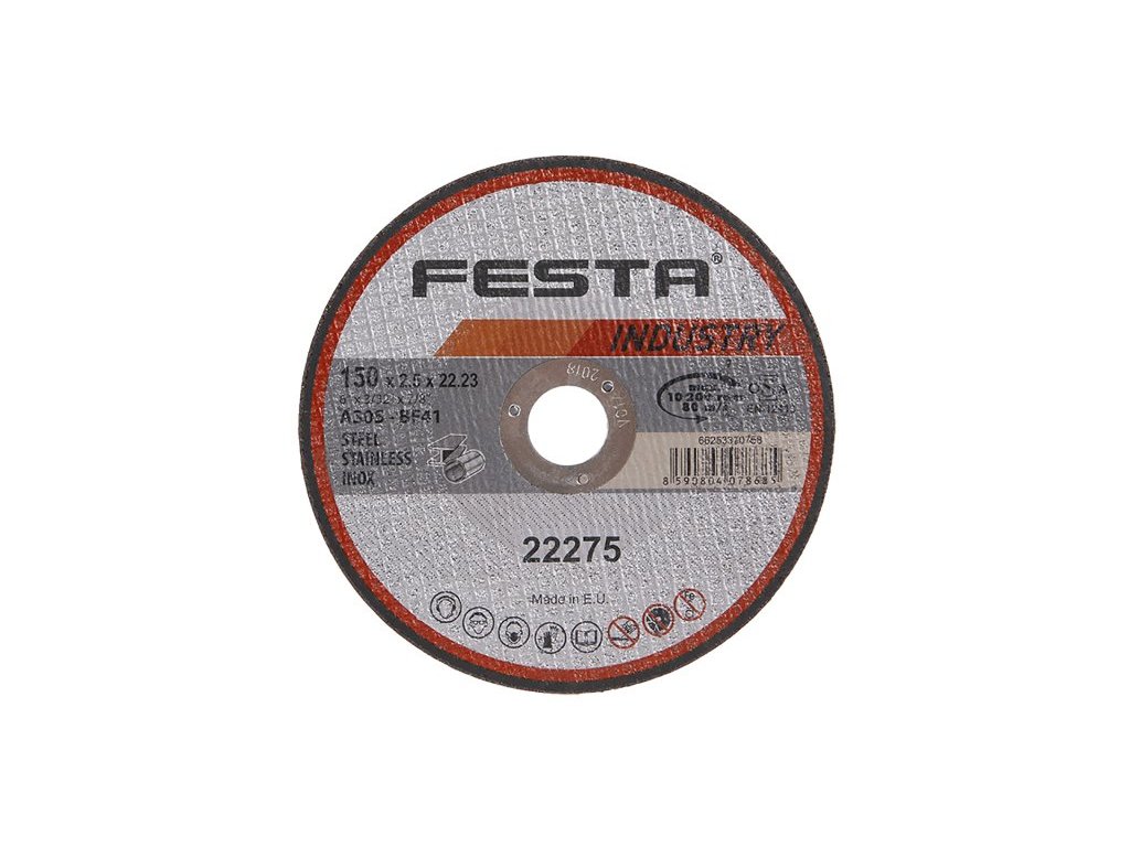 Profesionální řezný kotouč na kov, litinu, NEREZ. Vyrobeno v EVROPĚ!, řada kotoučů FESTA INDUSTRY je, jak již z názvu vyplývá určena zejména pro profesionální použití, kvalita ověřená reálnými zkouškami zaměřenými na počet a rychlost řezů. Druh zrna - KORUND, pojivo - syntetické pryskyřice na bázi aldehydu, provedení - ROVNÝ, max. pracovní rychlost - 80 m/s, max. přípustné otáčky - 12200 ot/min, PRO ZVÝŠENÍ PEVNOSTI ARMOVÁNO DVOUVRSTVOU SKLOTEXTILNÍ VLOŽKOU! KOTOUČE FESTA INDUSTRY SPLNUJÍ EN 12413 a homologaci OSA!