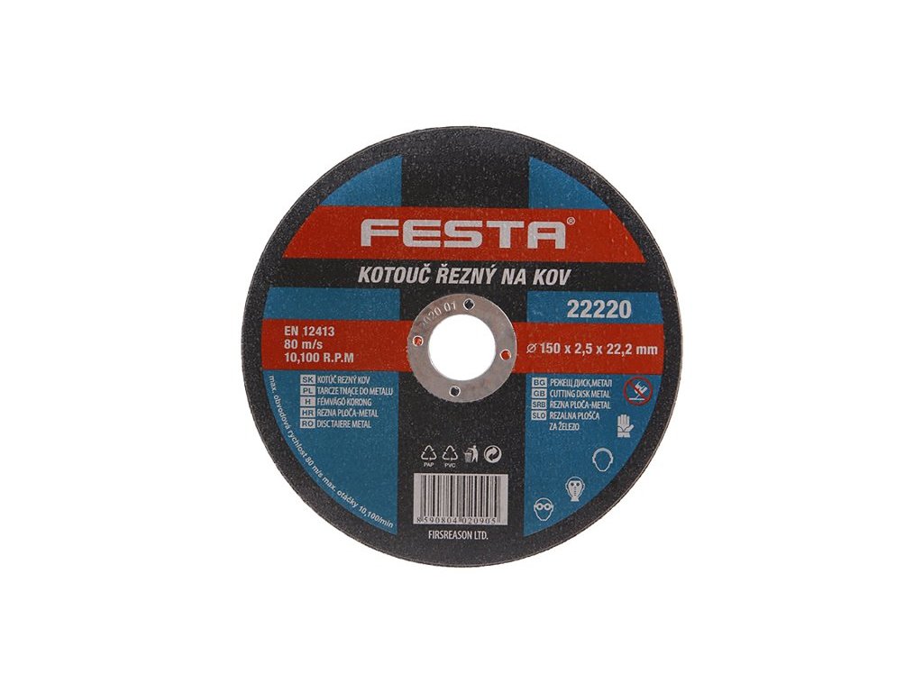 Druh Zrna: Korund Pojivo: Syntetické pryskyřice na bázi aldehydu Provedení: rovný Max. Pracovní rychlost: 80m/s Max. přípustné otáčky: 10200 1/min Pro zvýšení pevnosti armováno dvouvrstvou sklotextilní vložkou. Použití na kov, litinu.